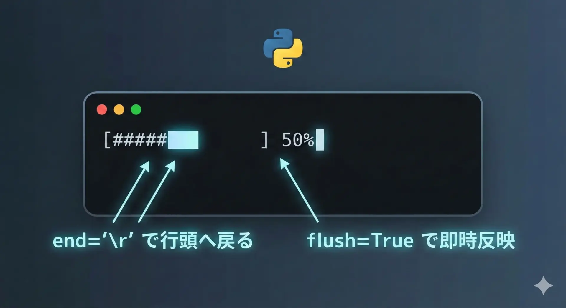 ここではend=""とflush=Trueを組み合わせることで、リアルタイムに更新される1行のプログレスバーを実現しています。