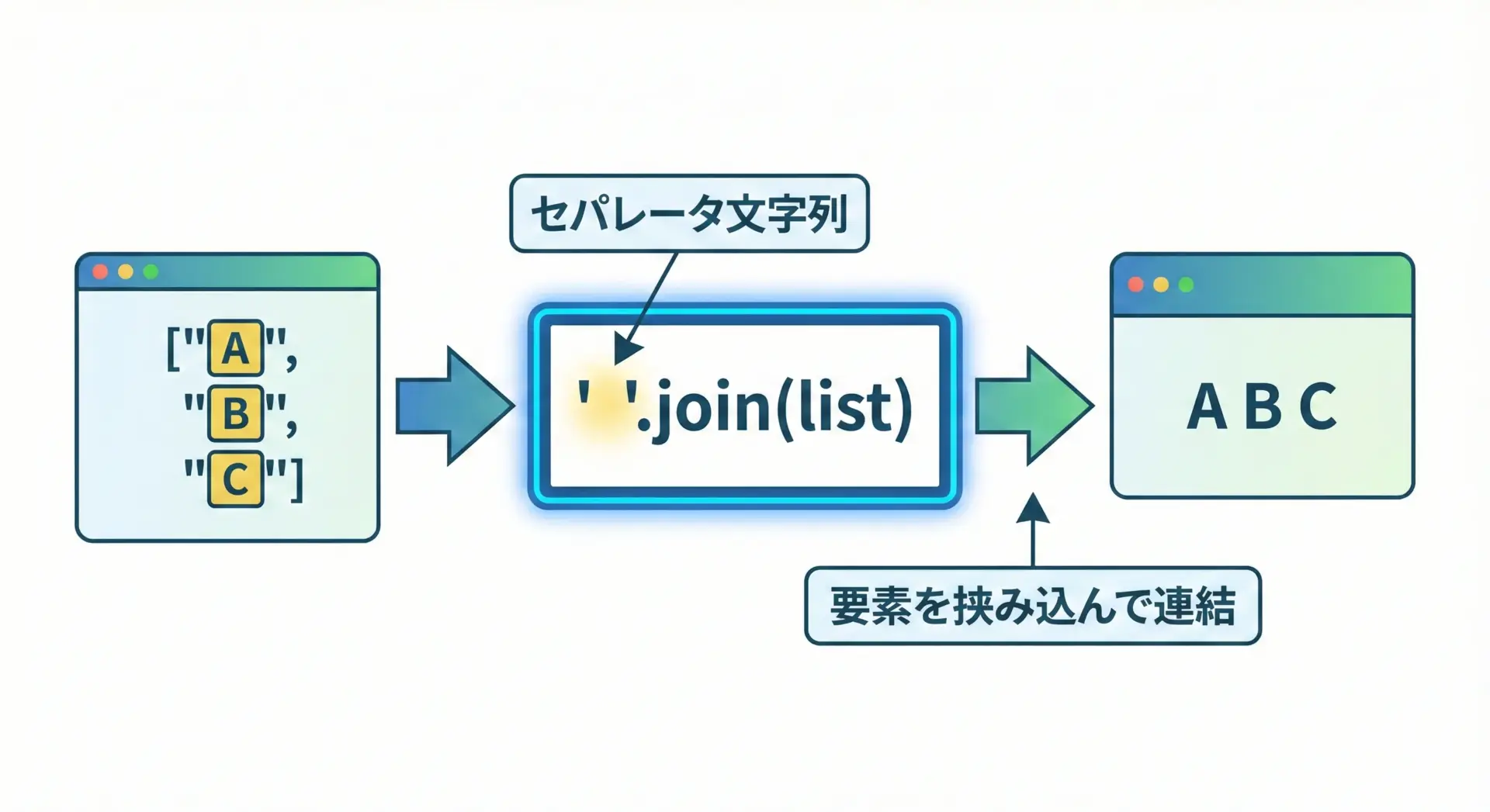 str.join()は、リストなどの複数要素を、指定した区切り文字で1つの文字列に結合するメソッドです。