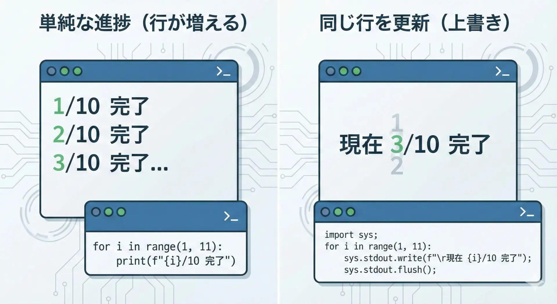 | 行更新 | end='', flush=True+文頭'\r' | プログレスバーやカウンタの更新 |