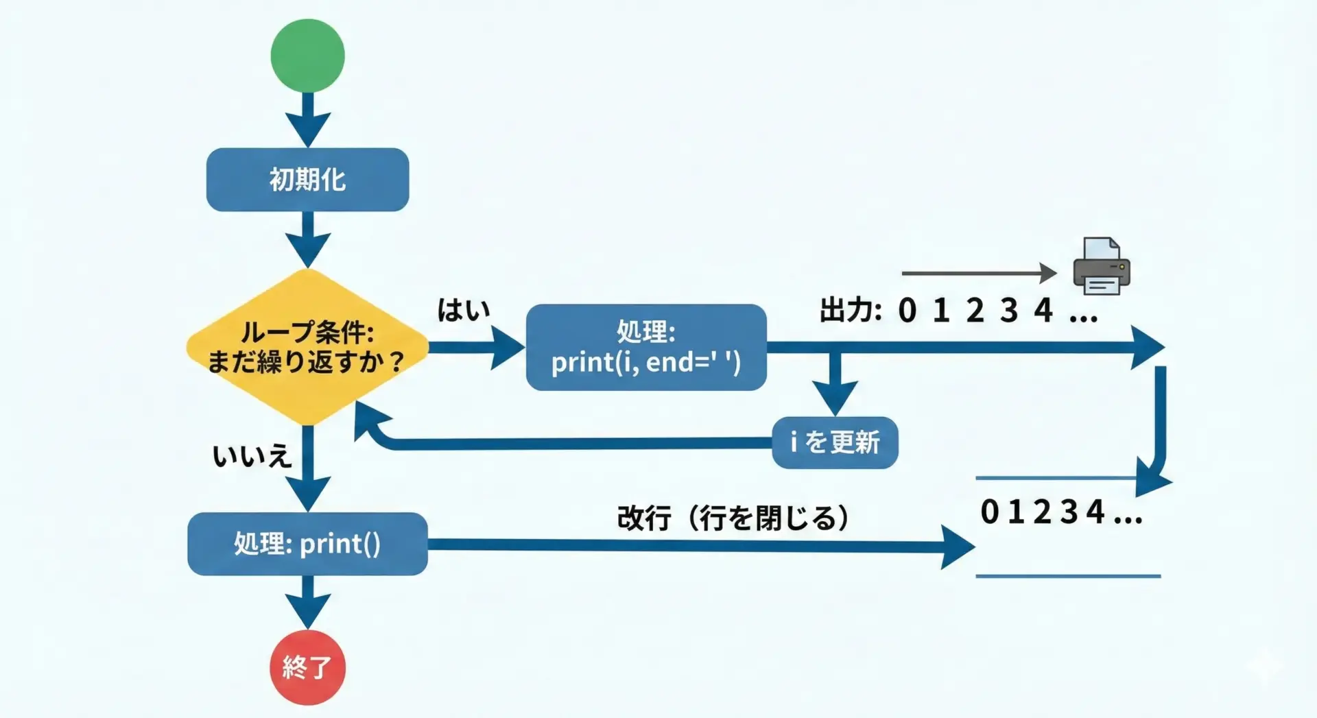 ループ処理では、繰り返しごとに改行せず、1行に並べて出力したいことがよくあります。
