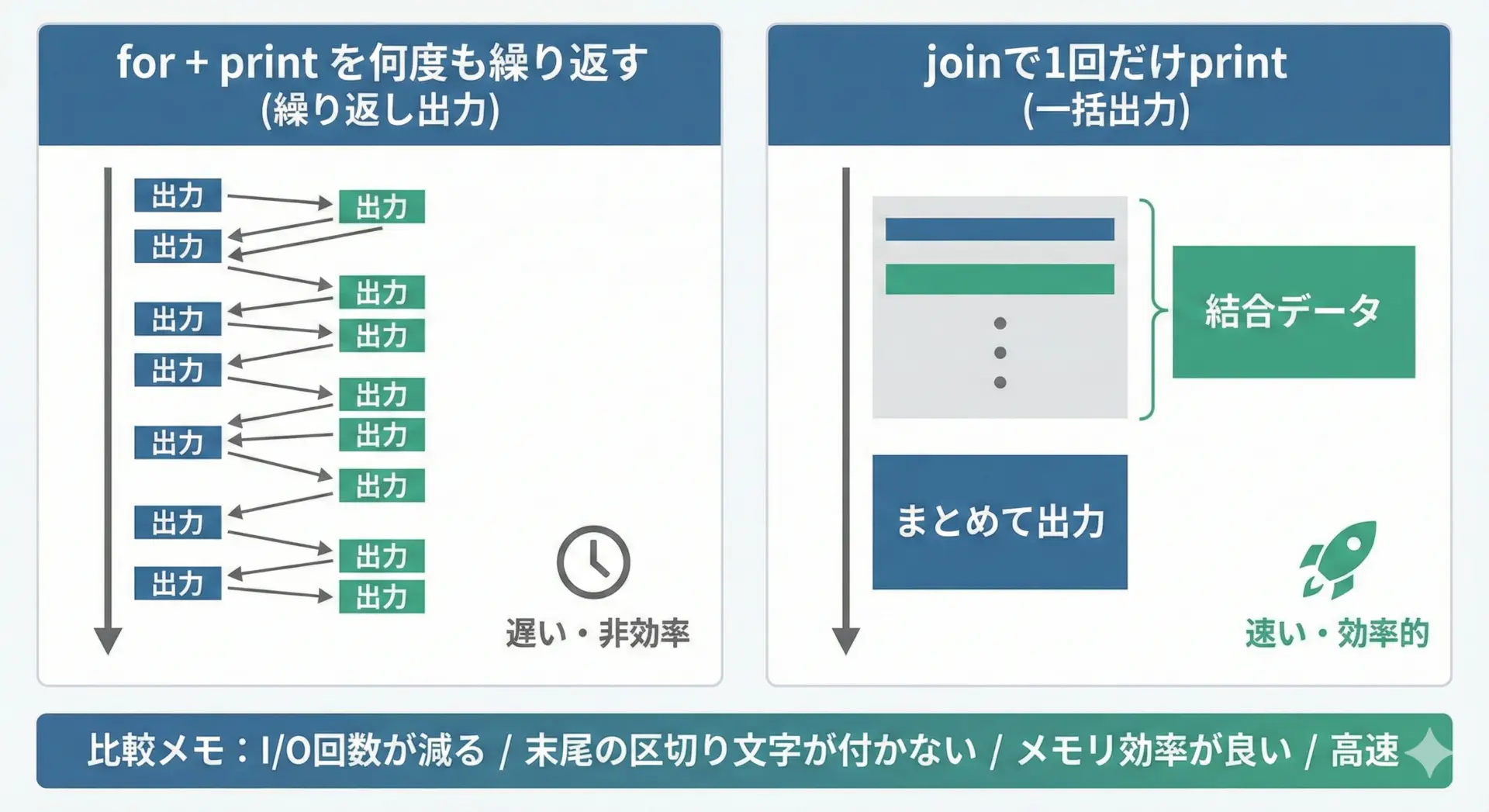 余分なスペースが全く入らず、printも1回だけで済むため、大量のデータを扱うプログラムでは効率的です。