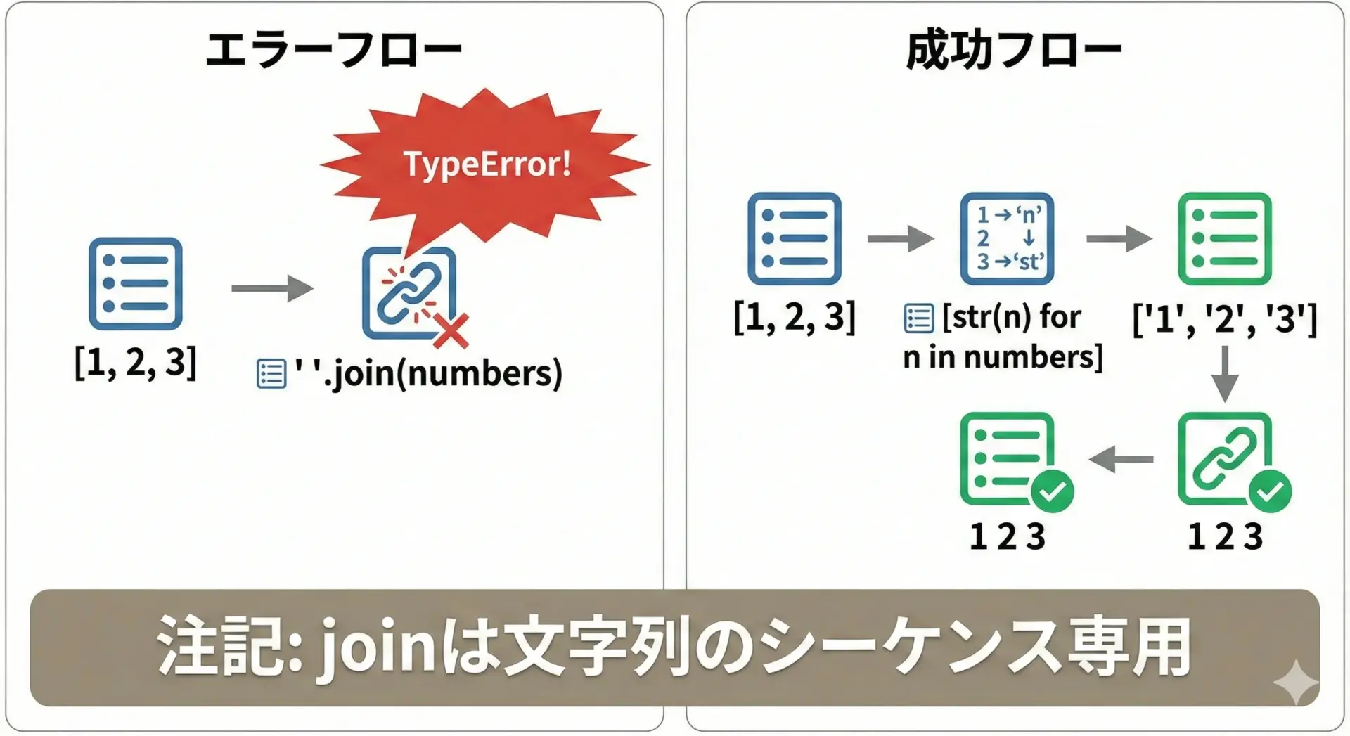 そのため、数値のリストをそのままjoinに渡すとエラーになります。