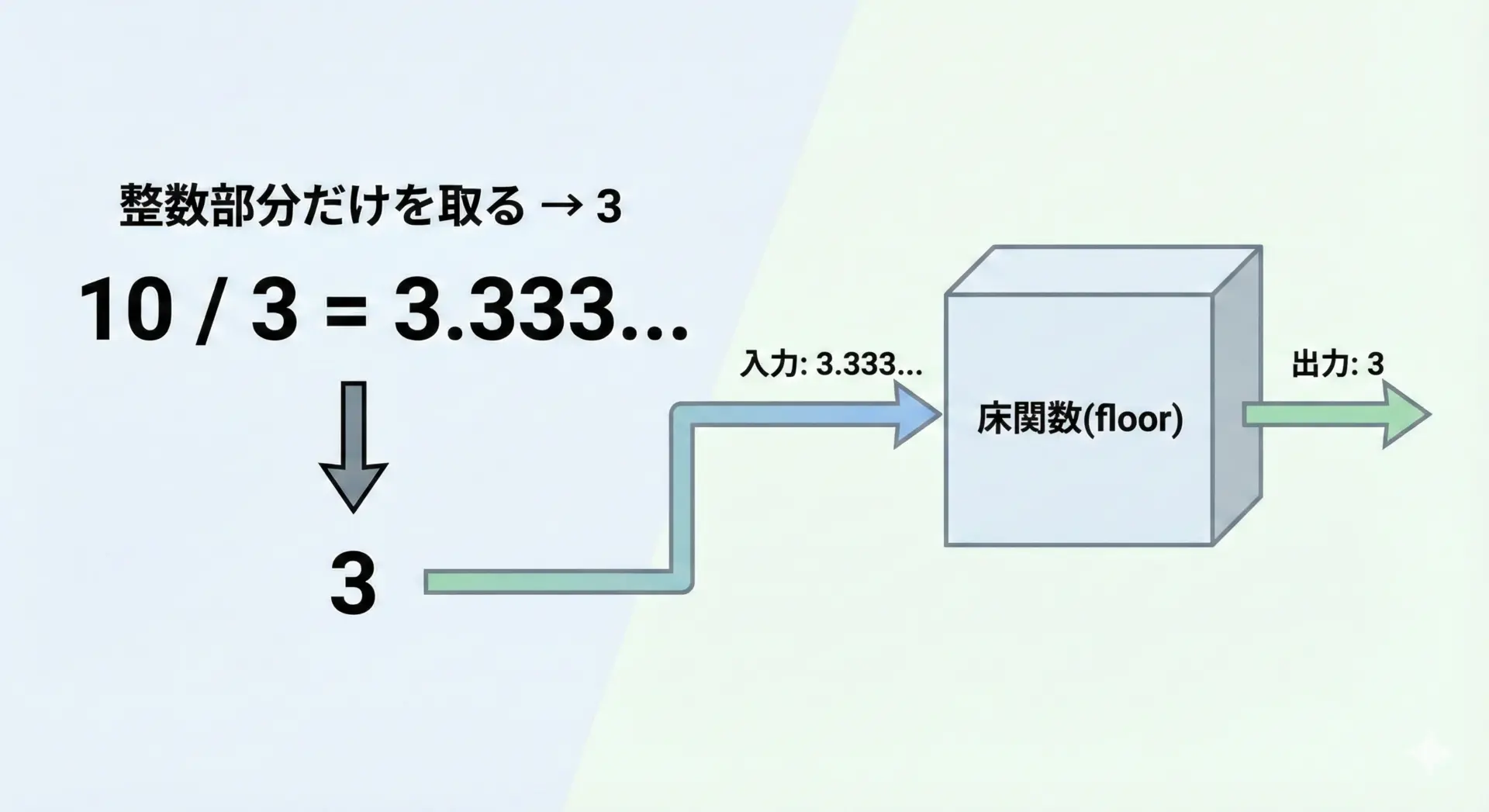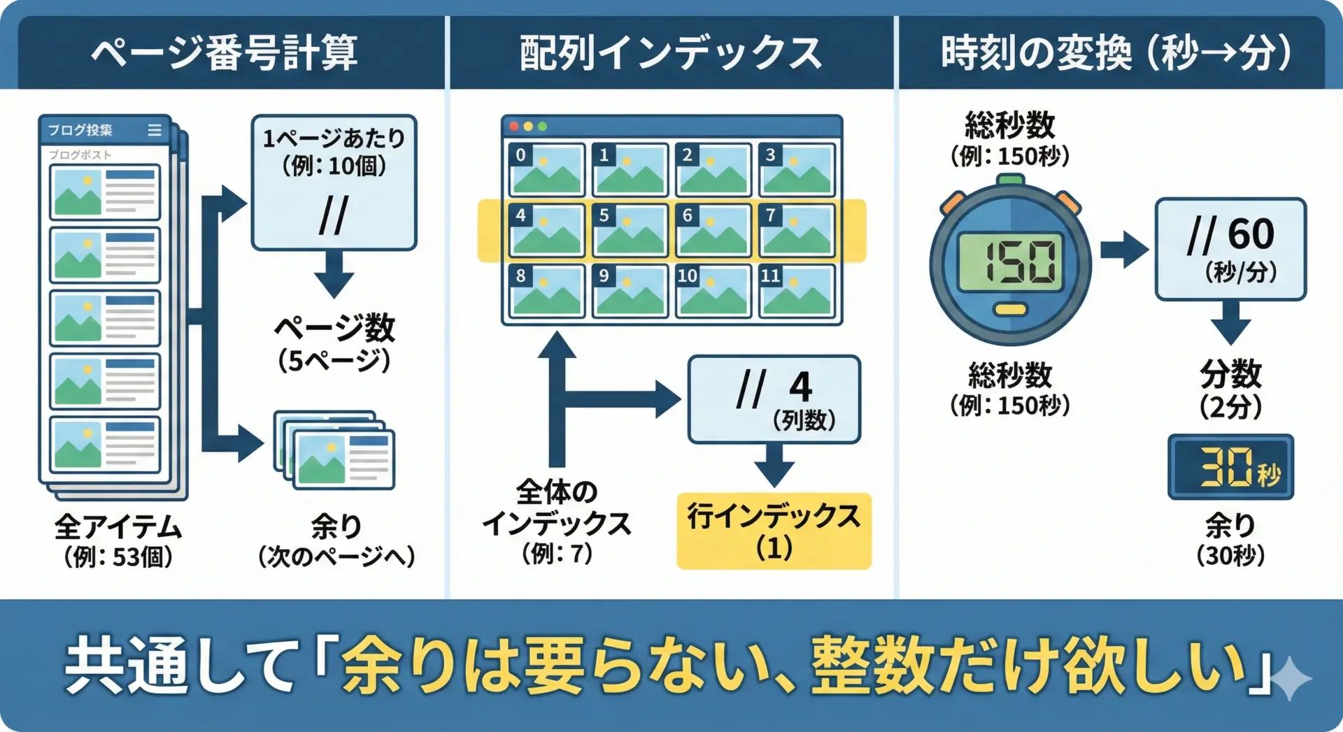 他にも、時間の変換(秒→分)や配列のインデックス計算など、「割り算の結果の整数部分だけが欲しい」場面全般//が役立ちます。