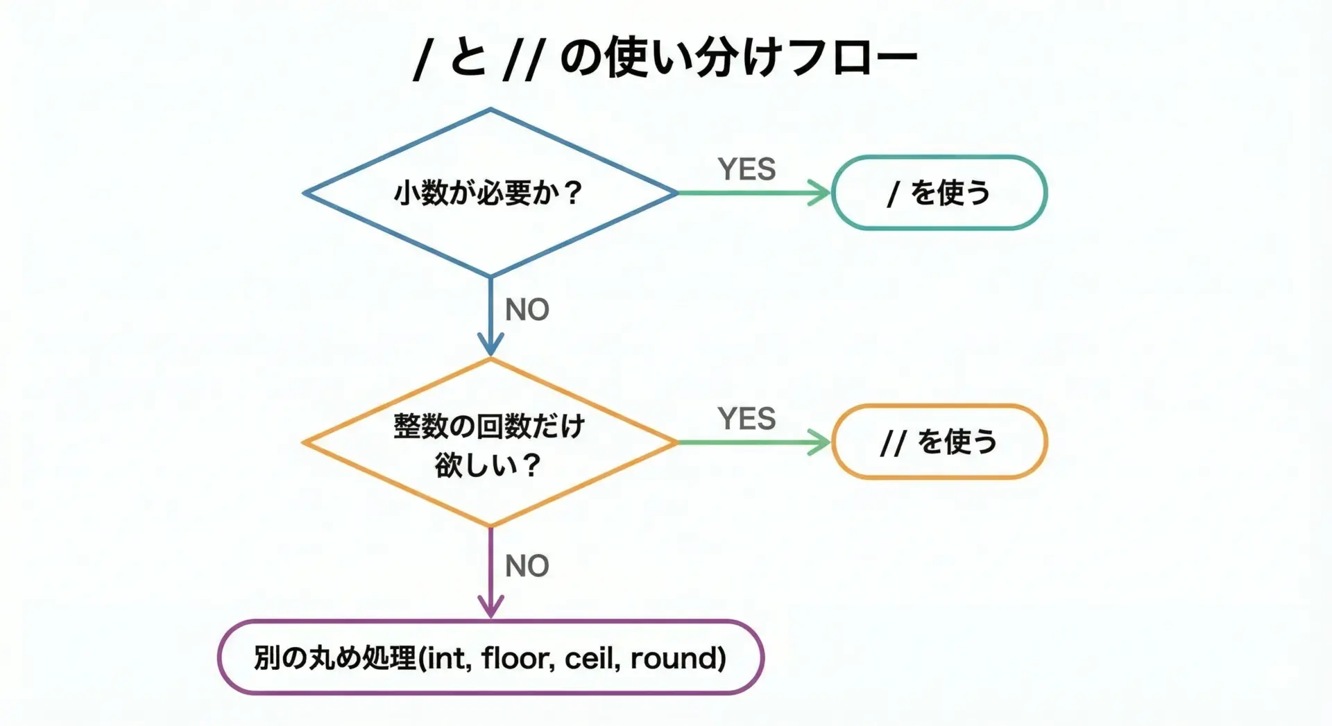 / と // の使い分けは、「小数が欲しいのか、整数だけでよいのか」を基準に考えるとシンプルです。