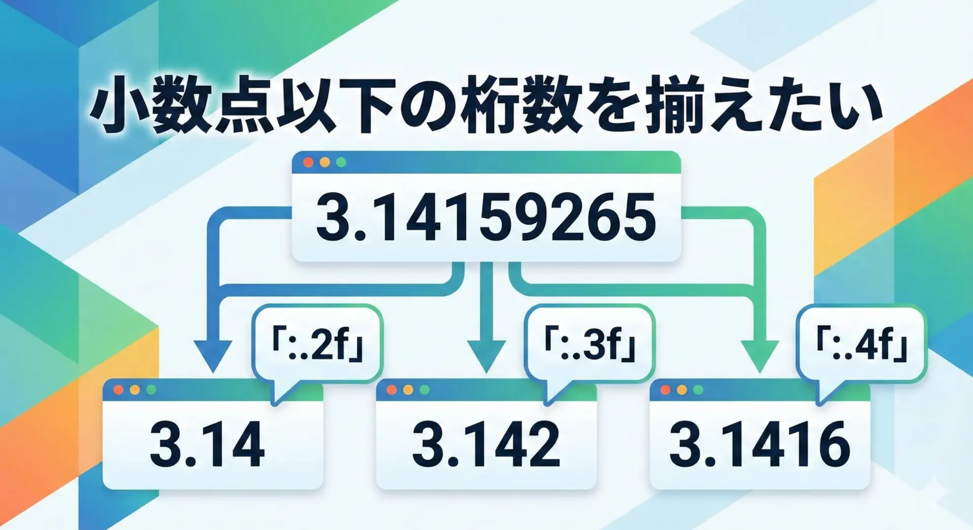 「計算結果自体を丸めたいのか」「表示だけをきれいにしたいのか」を意識して、roundか文字列フォーマットかを使い分けると良いです。