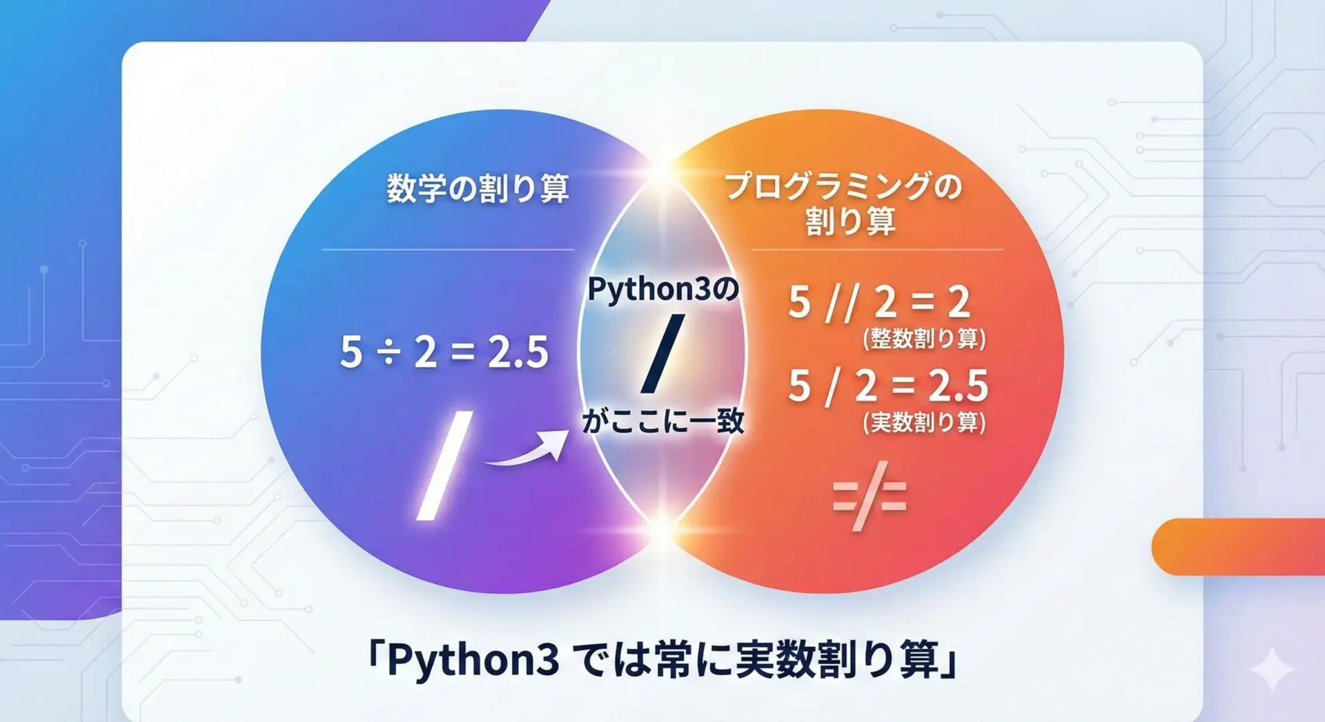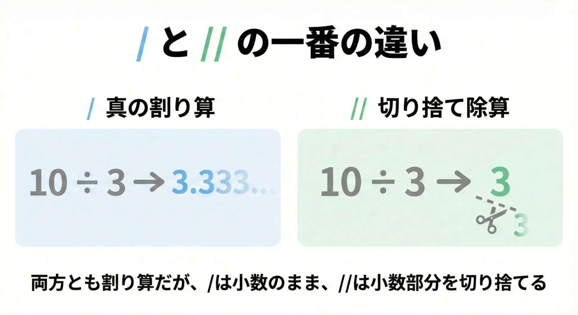 Pythonの///は見た目こそ似ていますが、「真の割り算」と「切り捨て除算」というまったく別の役割を持っています。