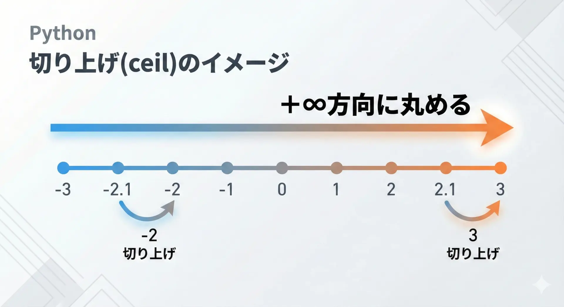 常に切り上げたいmath.ceil(x)2.1 → 3, -2.1 → -2