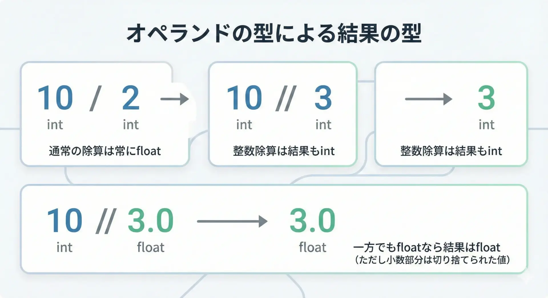 Pythonでは///のどちらでも、オペランド(左右の値)の型によって結果の型が少し変わります