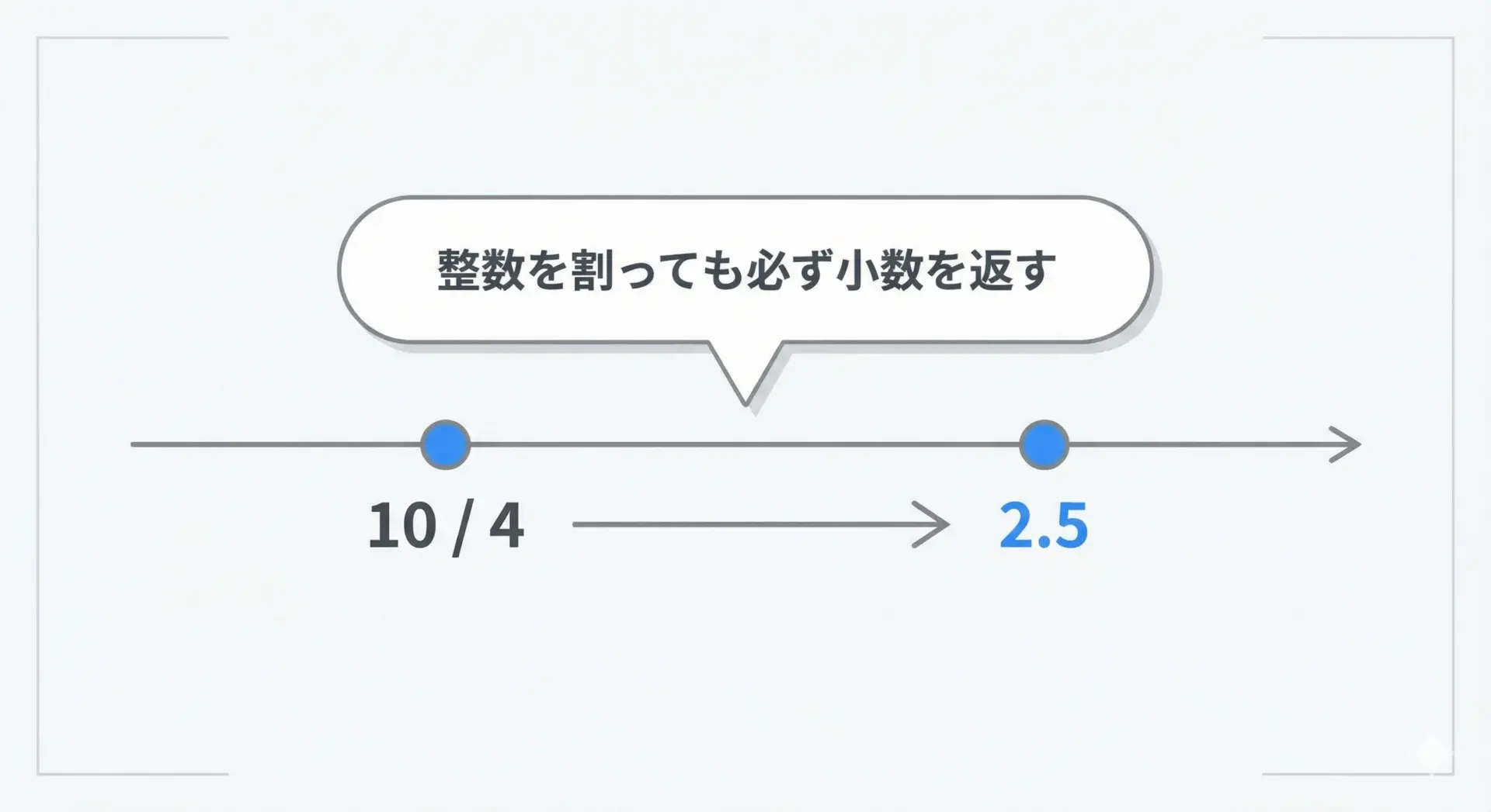 割り算の結果を必ず浮動小数点数(float)として返します。整数同士でも小数が返ります。