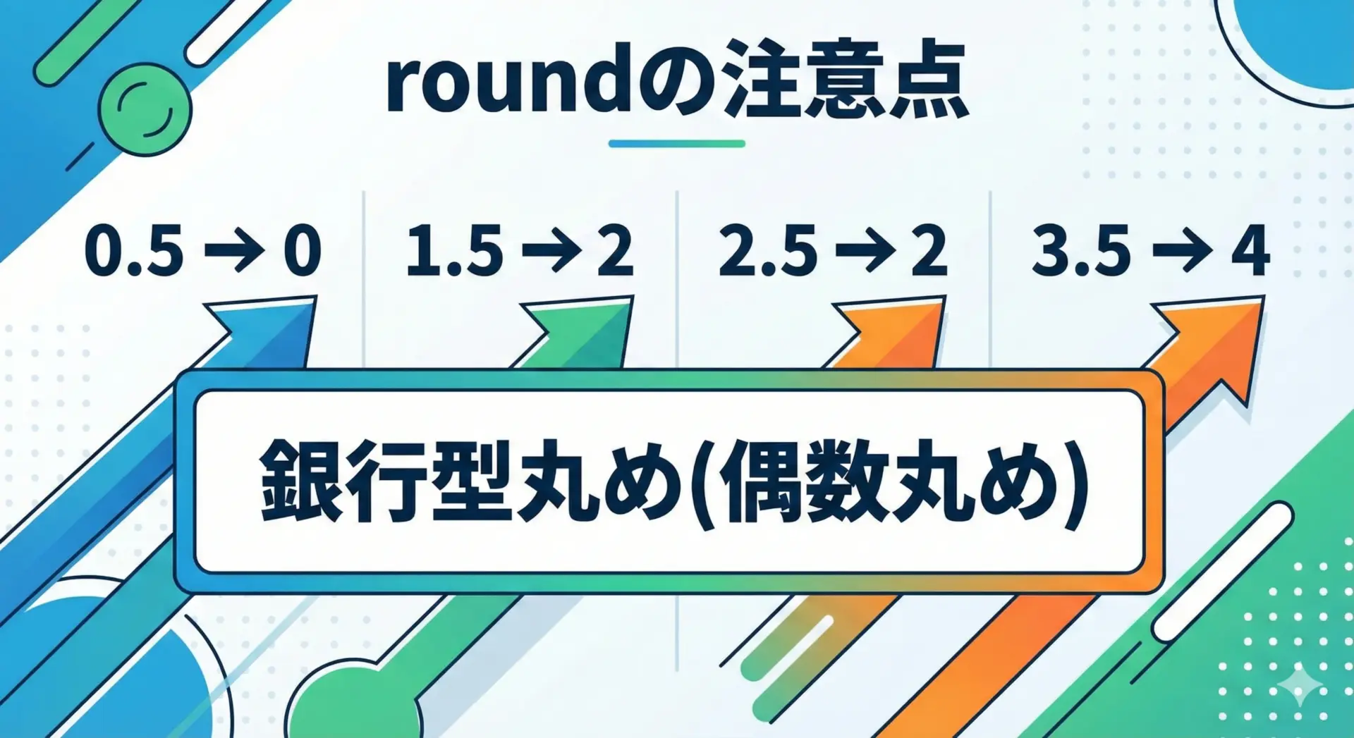 「5を必ず切り上げたい」ような用途(請求金額の計算など)では、そのままroundを使うと期待と違う結果になる可能性があります。