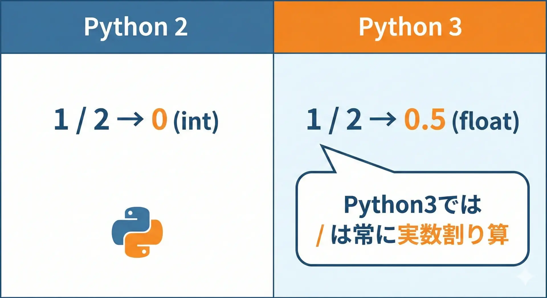 Pythonのバージョンによって/の挙動が異なる点は、古い記事を読むときによく引っかかるポイントです。
