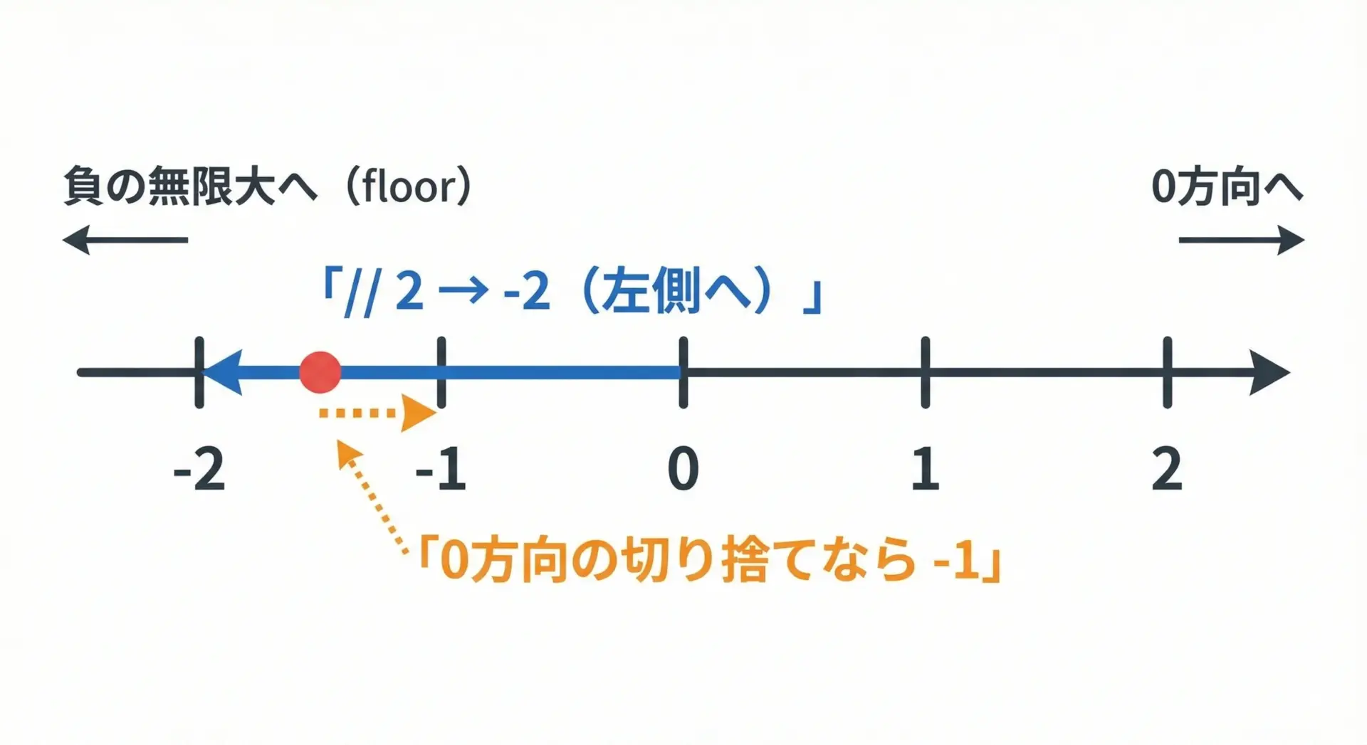 「負の値でどう動いてほしいか」を基準に、intmath.floor//を選ぶのが正しい使い方です。