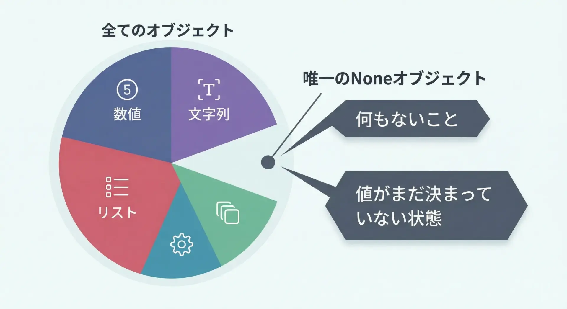 PythonのNoneは、「何もないこと」を表すための特別なオブジェクトです。