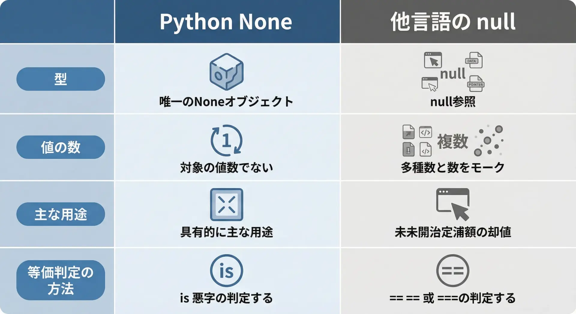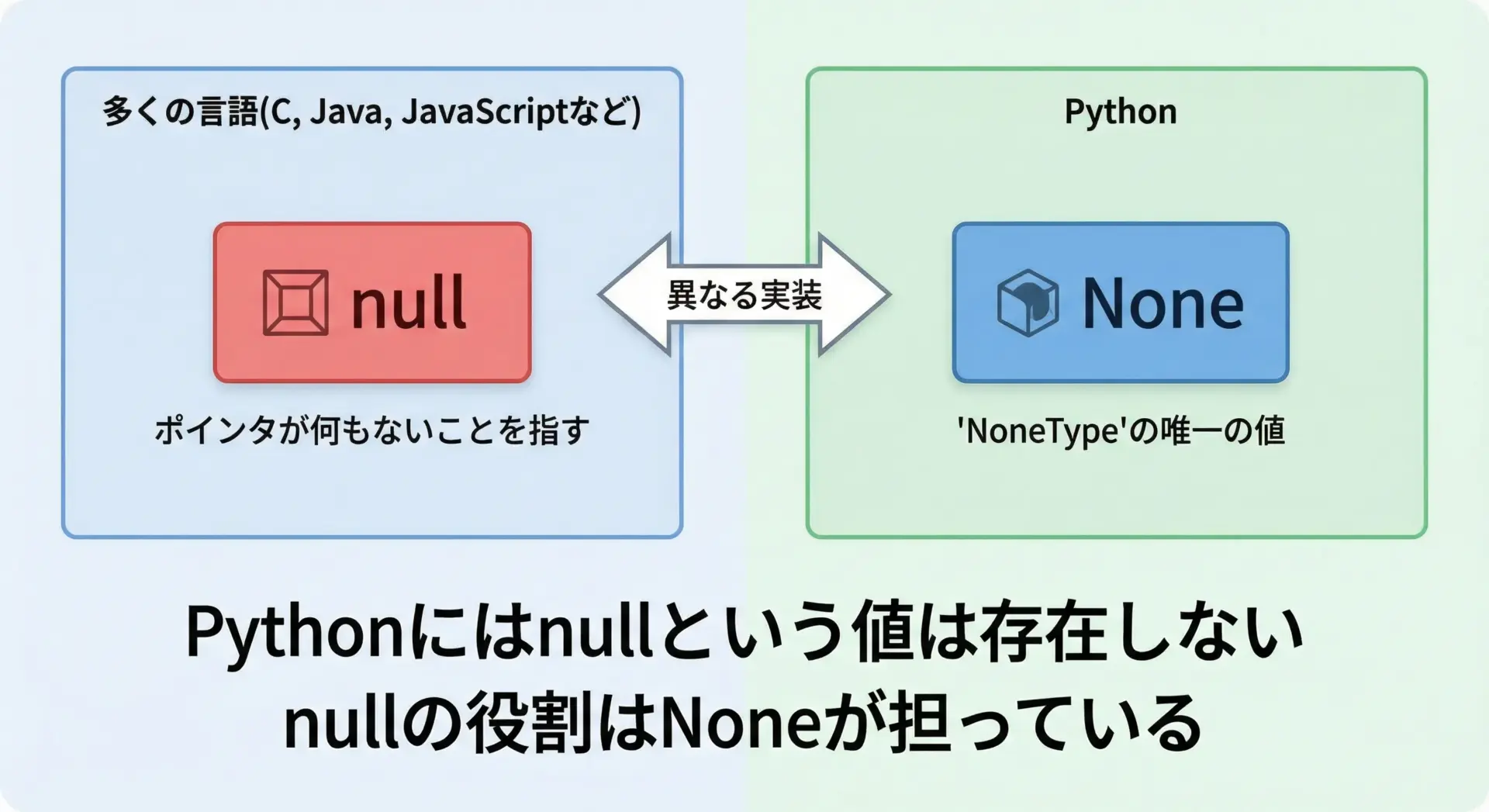 他言語経験者にとって、PythonのNonenullのように感じられますが、厳密には少し違いがあります。