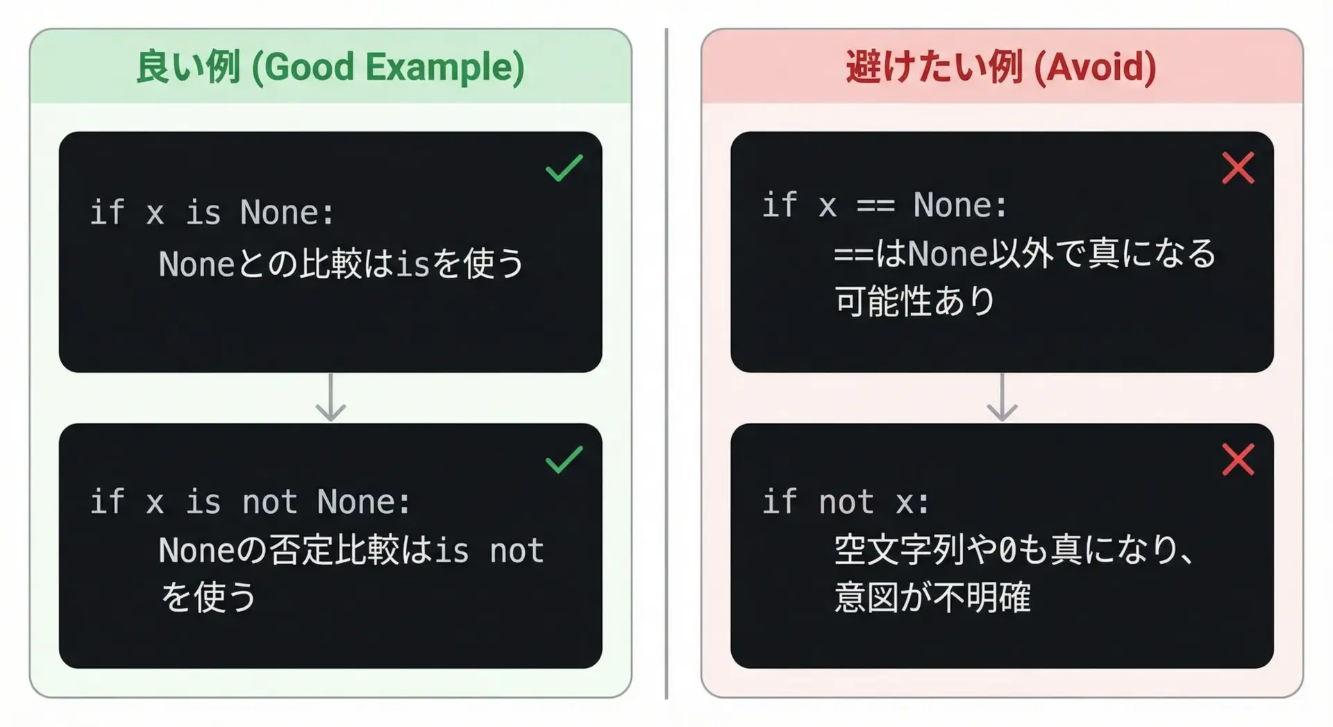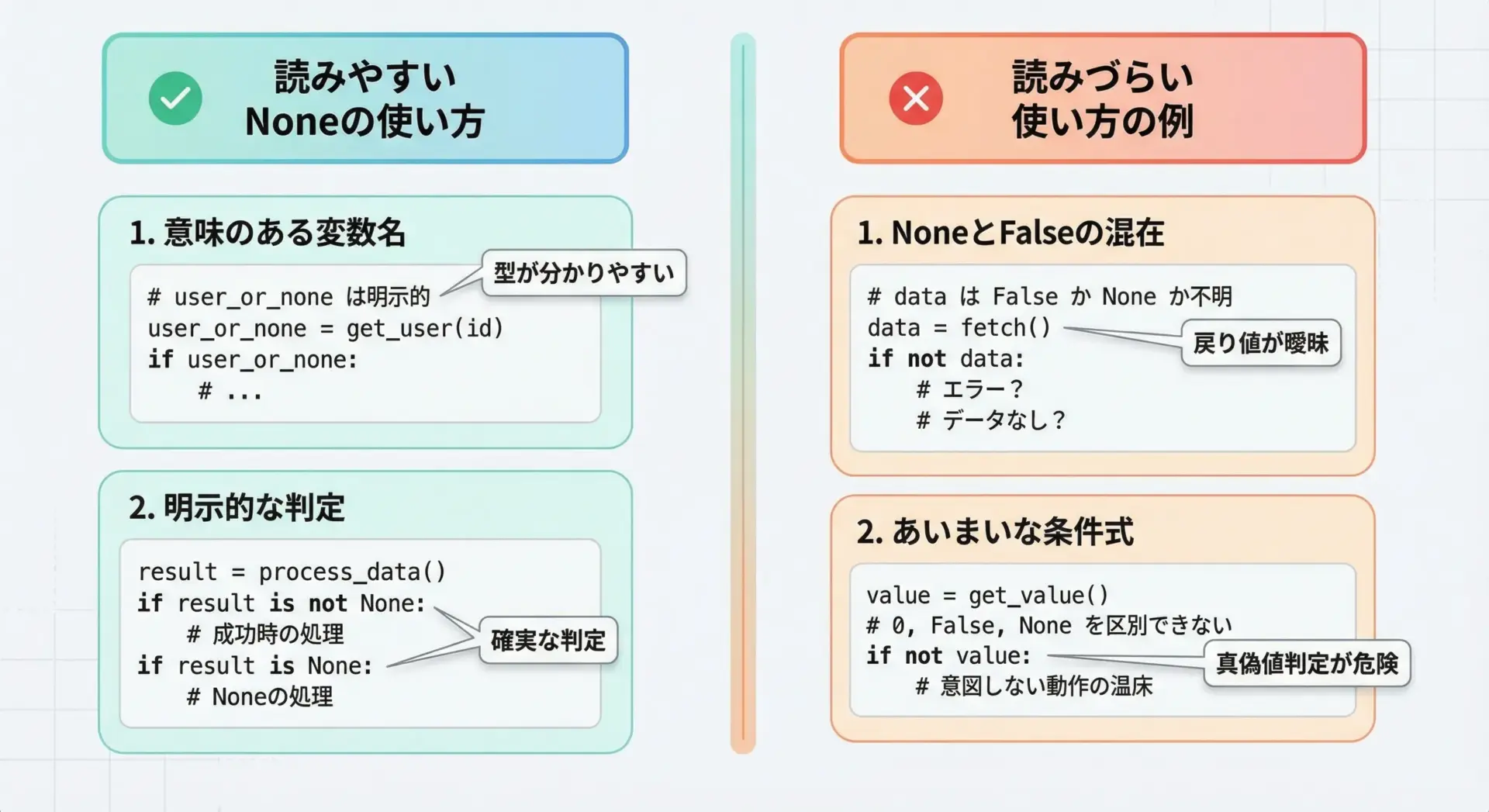 このように「Noneを使う目的」と「Falseや0、空との違い」を常に意識してコードを書くと、将来の自分や他の開発者にも読みやすいコードになります