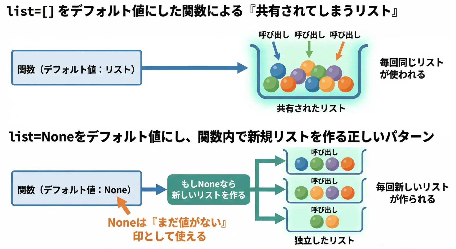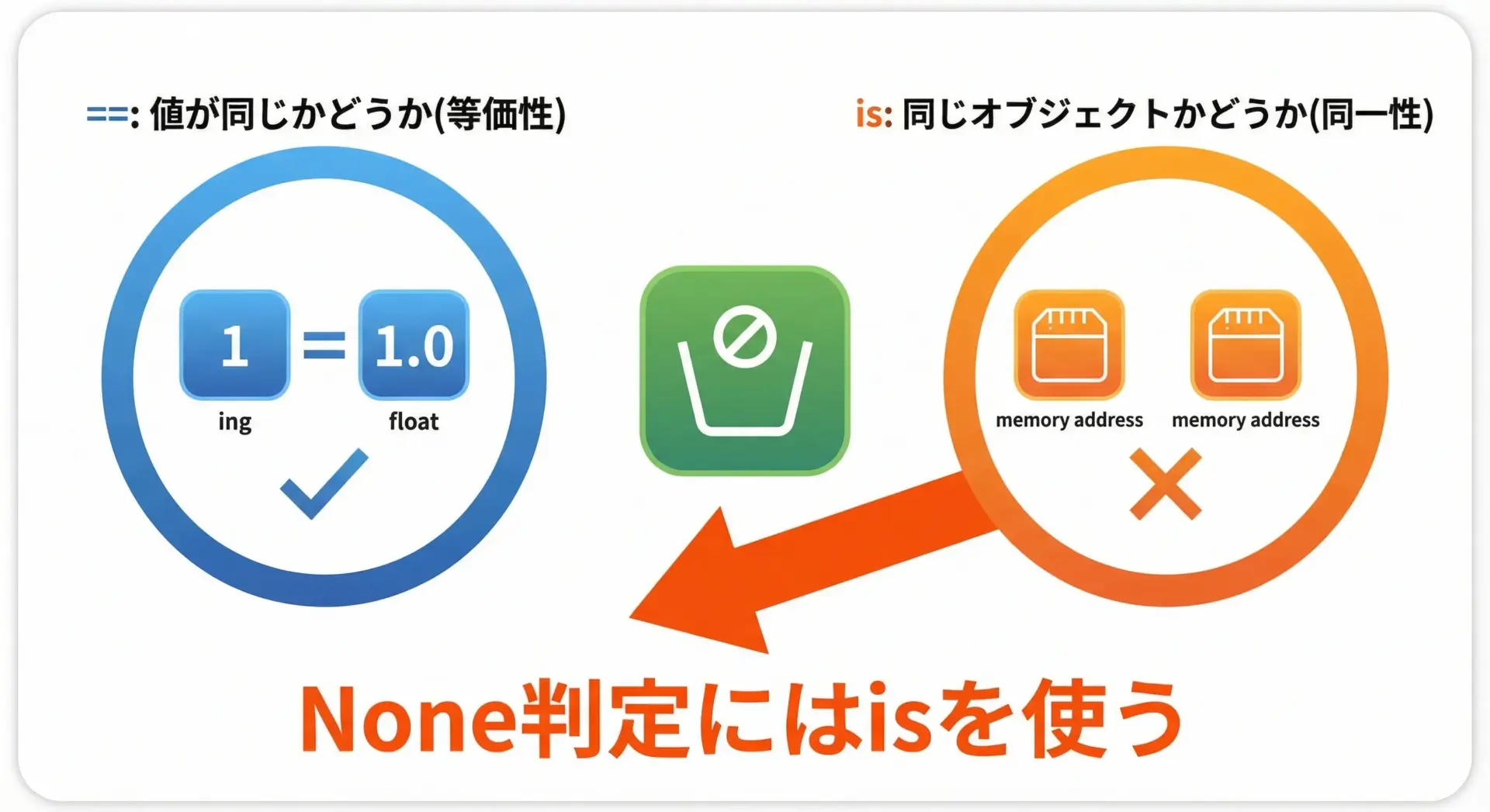 判定にはisを用い、デフォルト引数や戻り値でNoneをどう使うかを丁寧に設計することで、バグを防ぎつつ読みやすいコードを書けます。