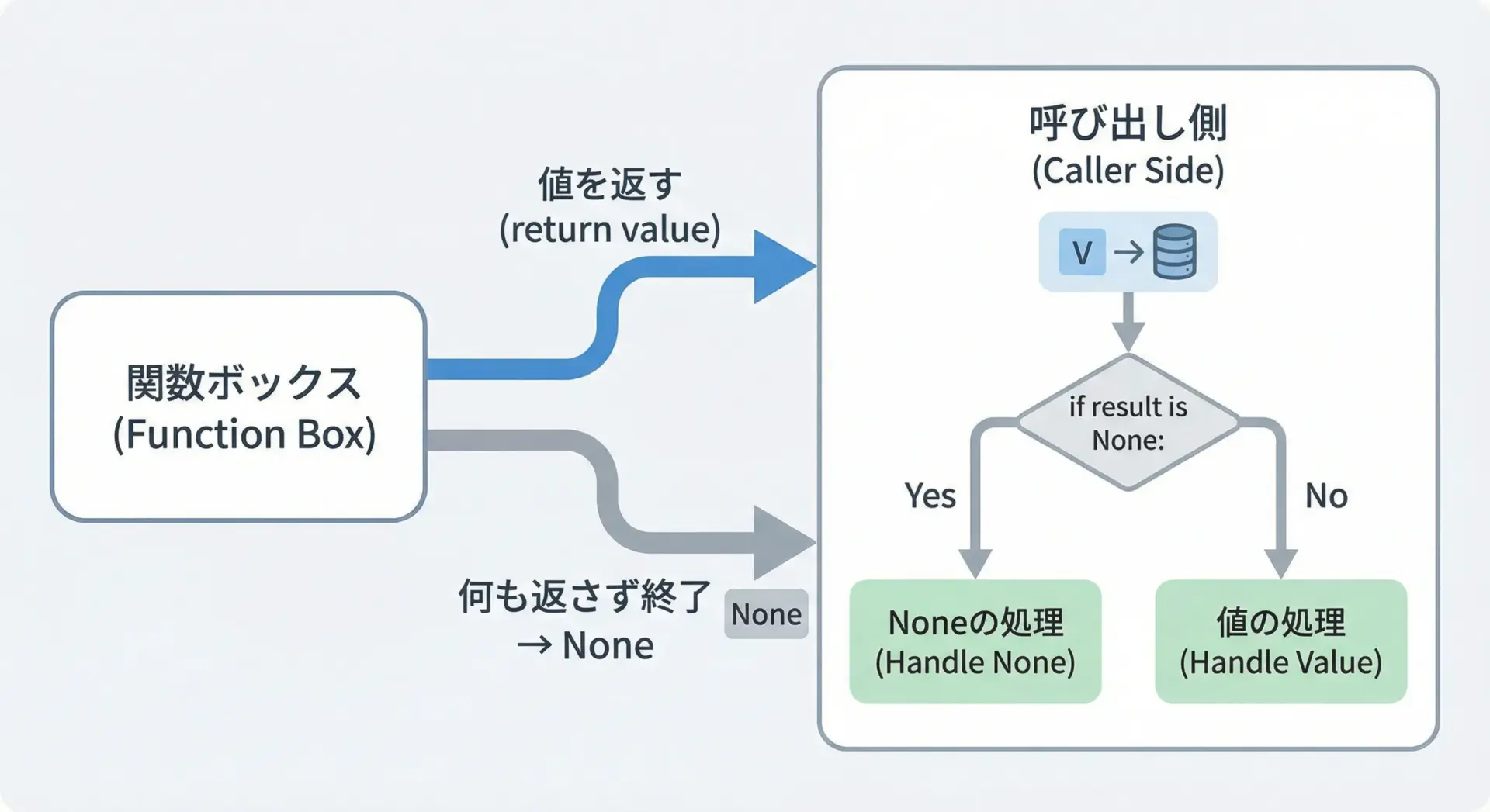 このように、戻り値としてNoneを使う関数は、「結果なし」かどうかをis Noneで判定するのが自然です。
