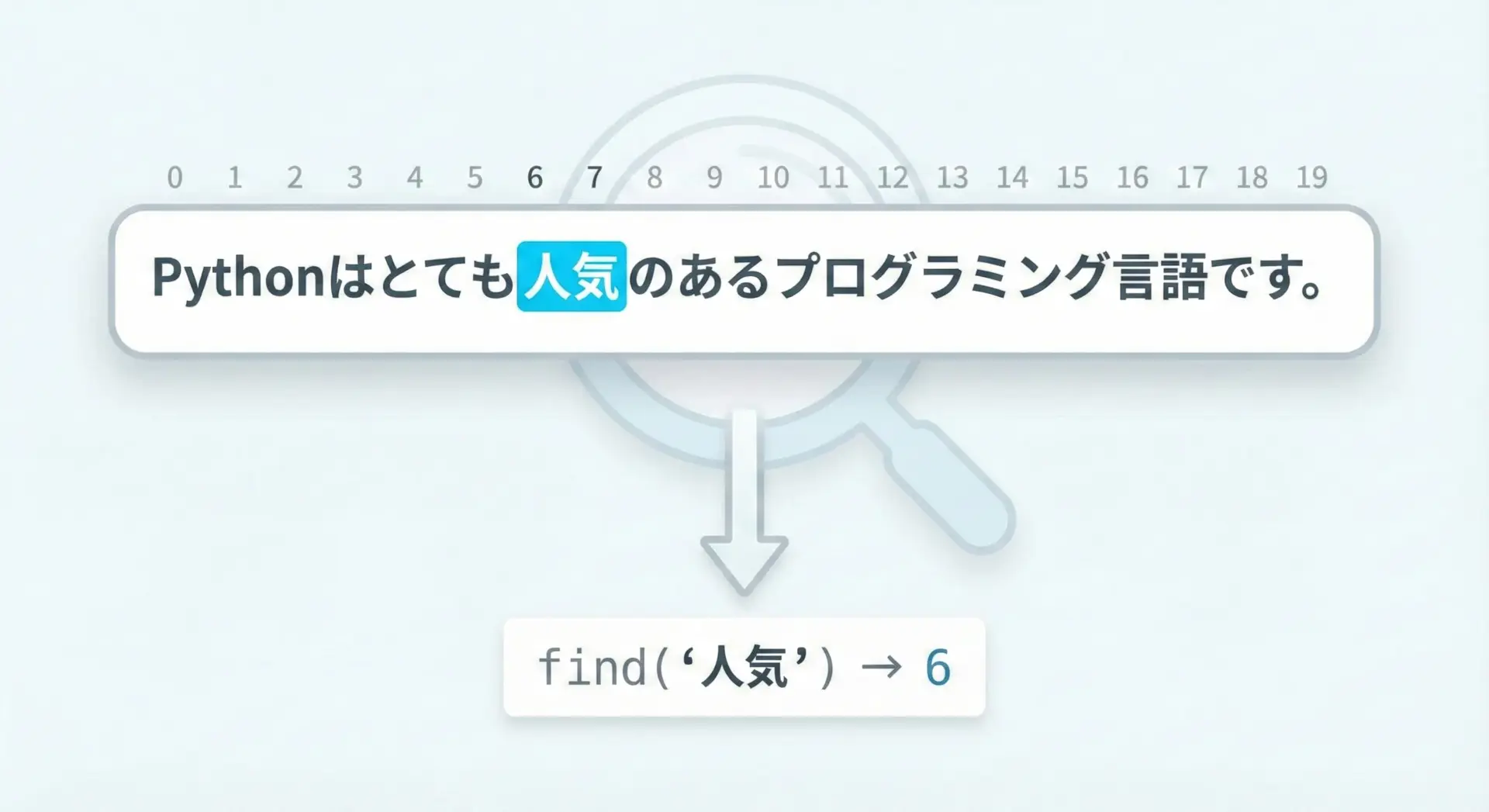 代表的なのがstr.find()とstr.index()です。どちらも、見つかった位置を0から始まるインデックスとして返します。 - 含まれているかどうかだけ知りたい場合