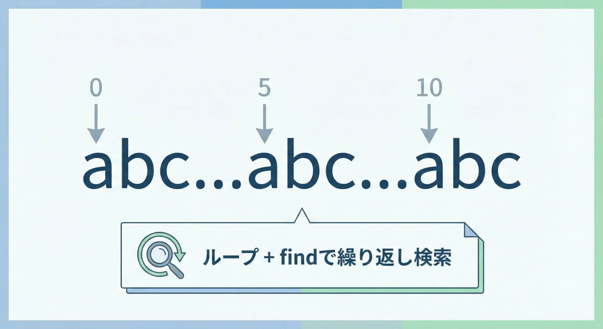 この記事では、このうち位置を取得するfindとindexに焦点を当てて詳しく解説し、その周辺のテクニックにも触れていきます。