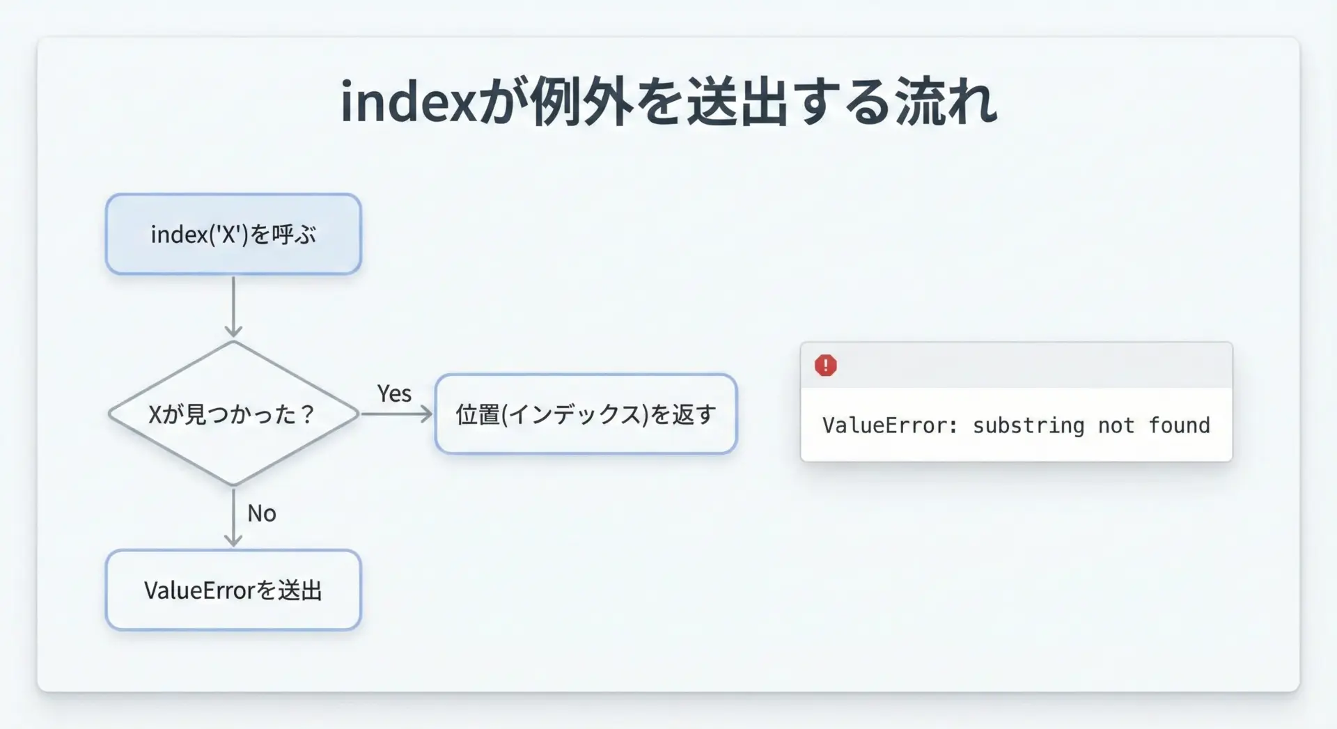 プログラムがこの時点で止まってしまうため、indexを使う際には、この例外をどう扱うかをあらかじめ考えておく必要があります。