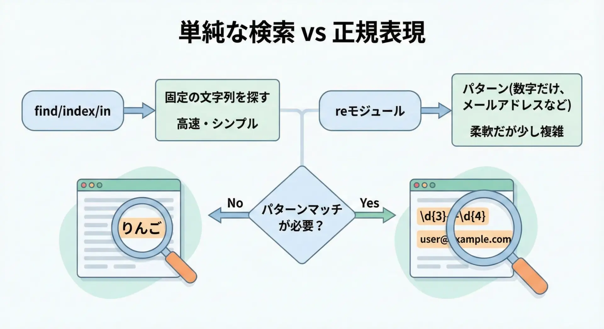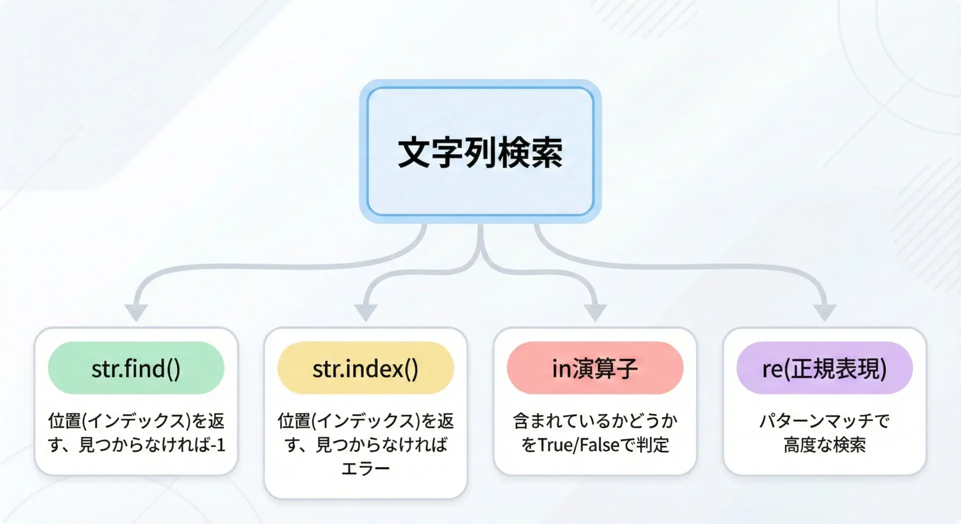 単純な「固定文字列検索」ならfind/index、複雑な「パターン検索」ならreと覚えておくとよいでしょう。
