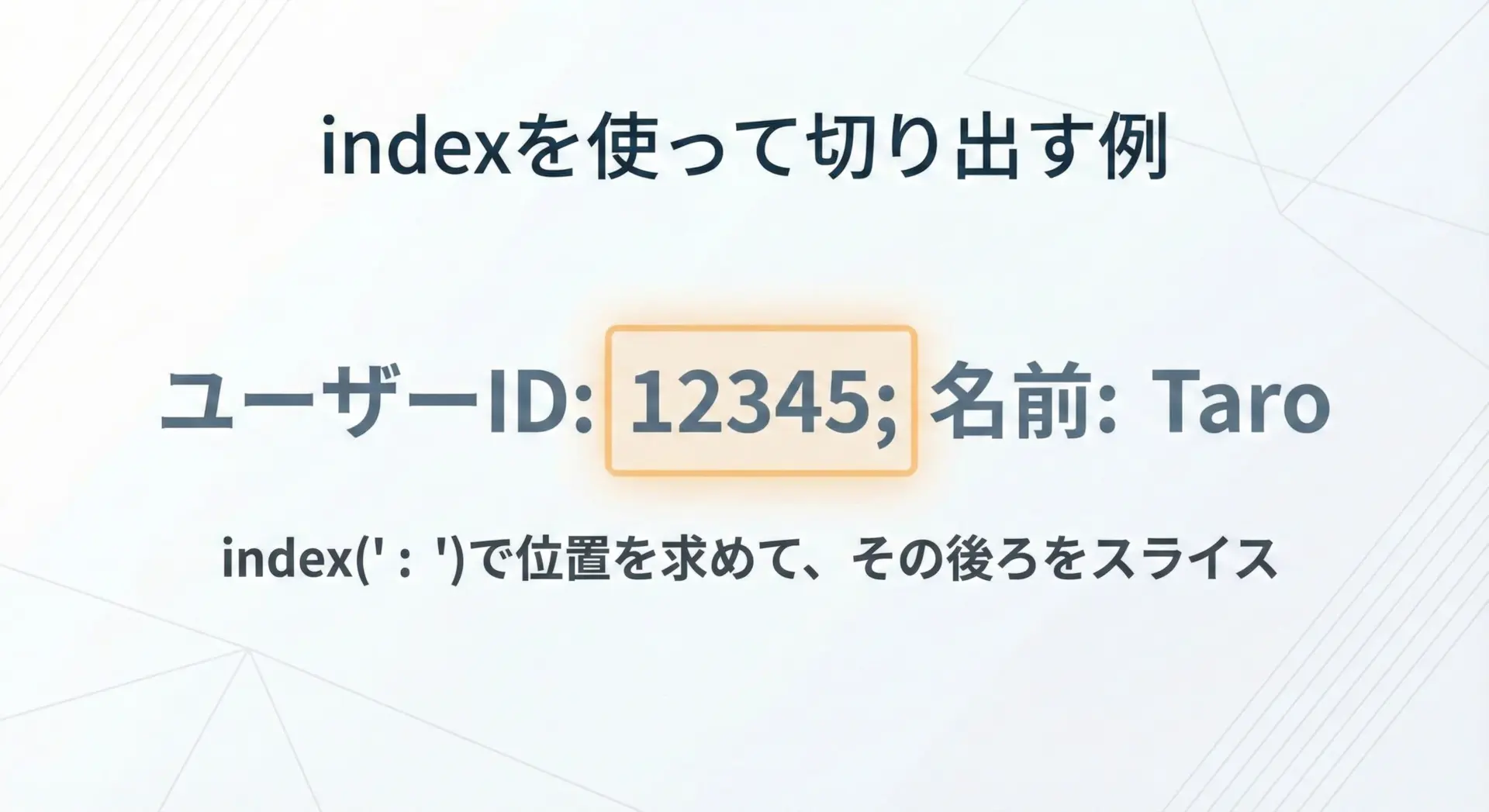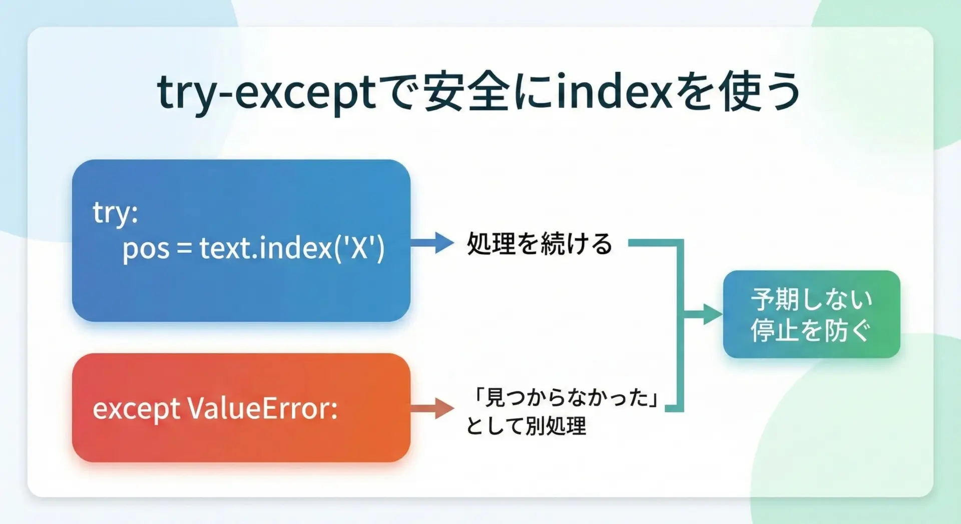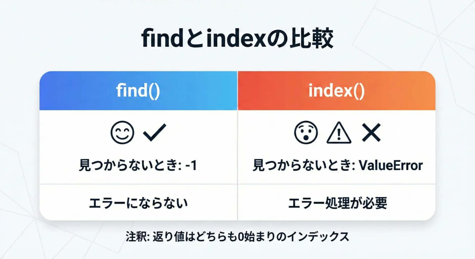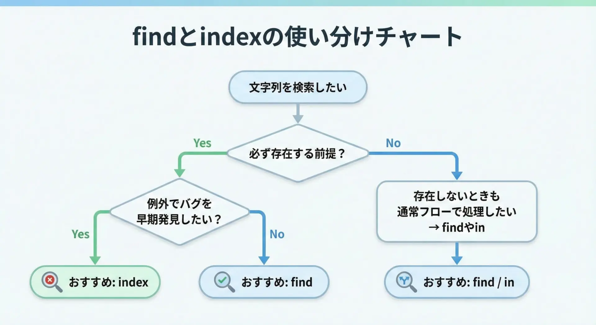 文字列が存在するかどうかわからないが、エラーで止まってほしくない場合です。戻り値が-1かどうかで分岐すればよいため、ログ解析や検索機能など、多くの実務コードではfindが多用されます。 - indexを使うとよい場面