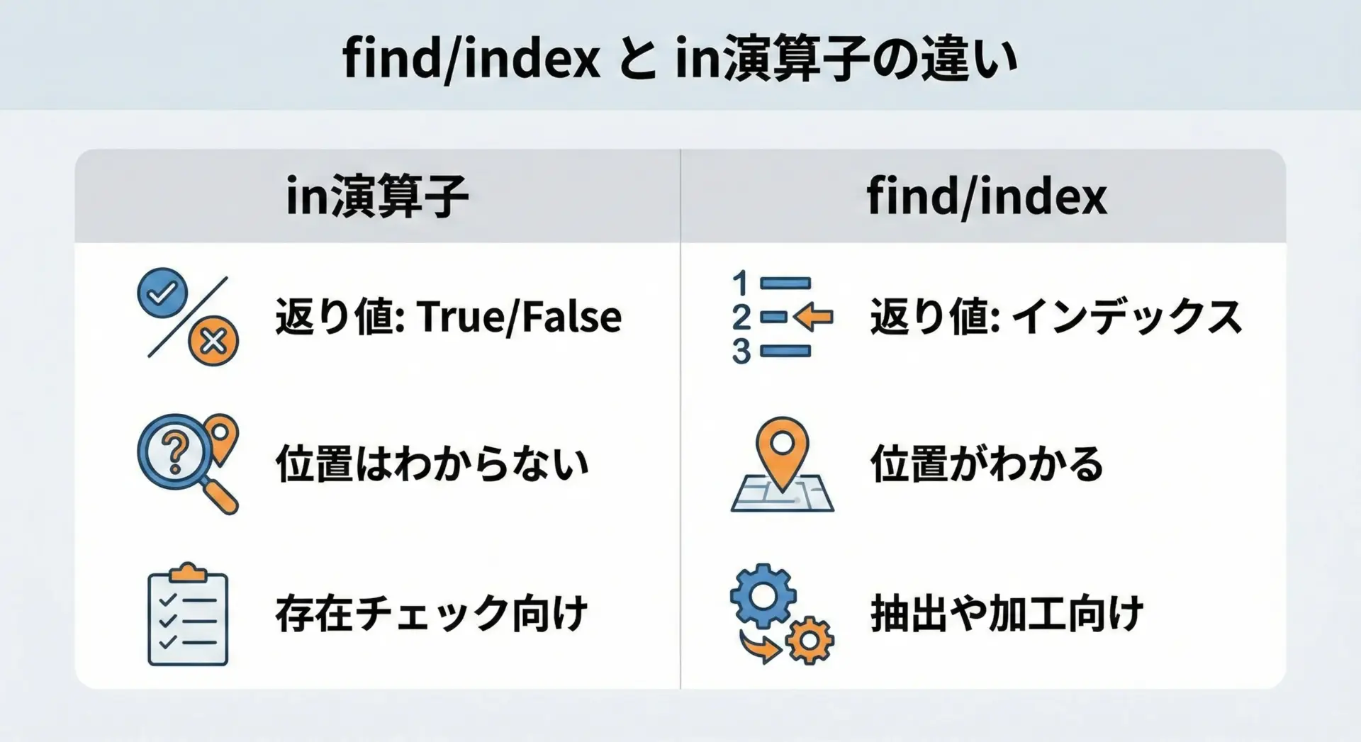 ここまでの内容を踏まえて、findとindexの使い分けを整理しておきます。