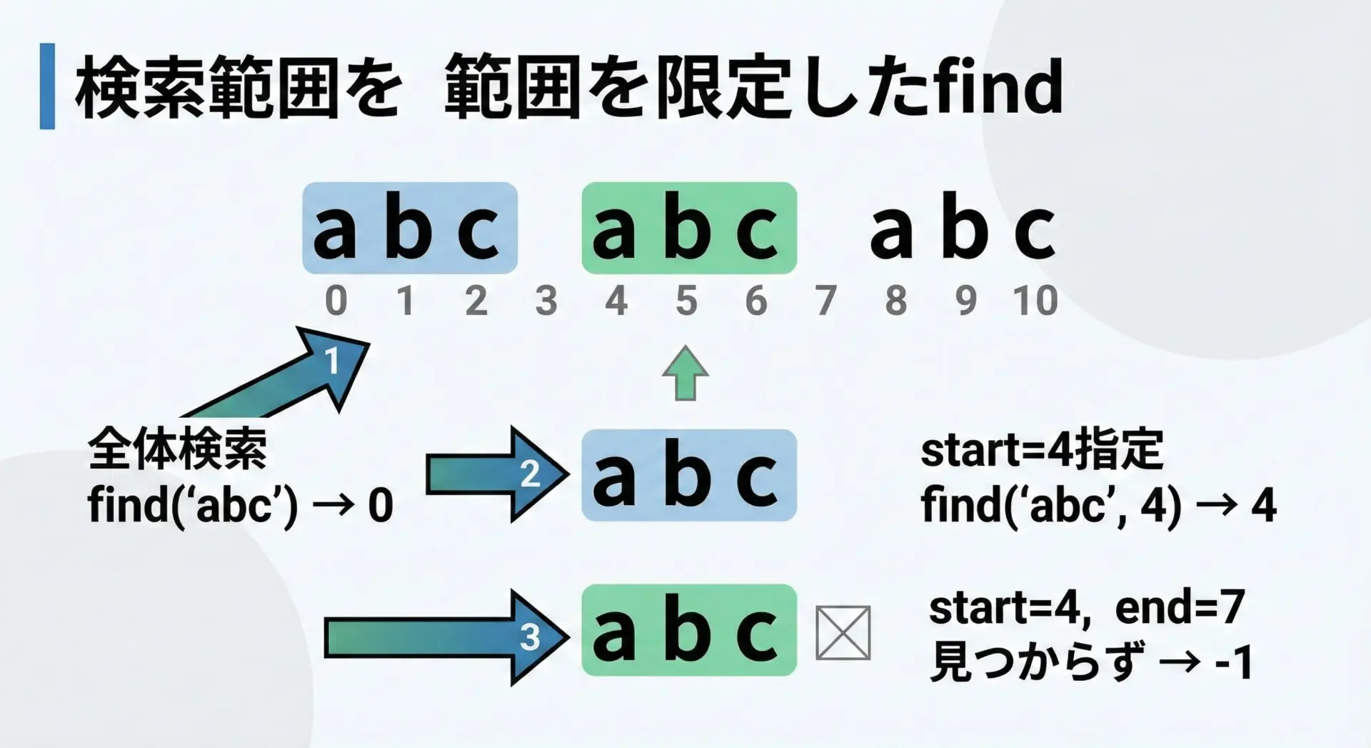 pos3 = text.find("abc", 4, 7) # インデックス4以上7未満の範囲で検索