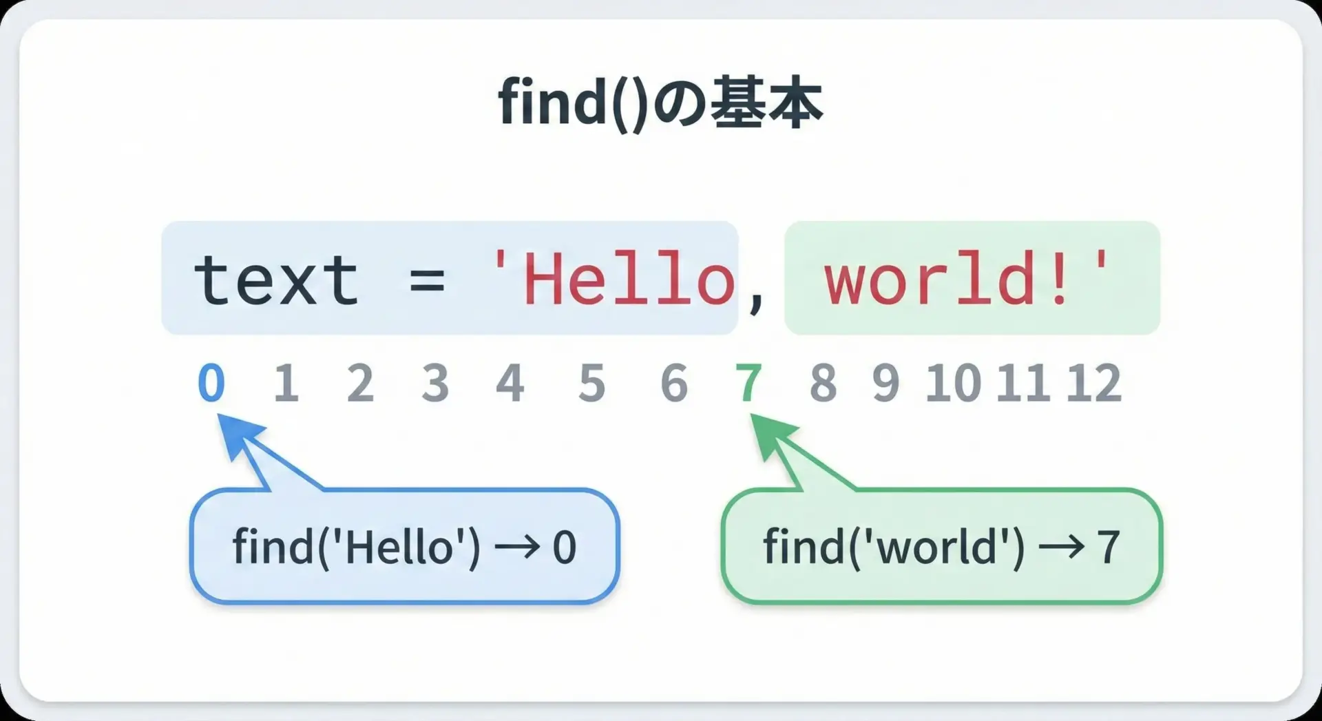 pos_hello = text.find("Hello") # "Hello" の開始位置を検索