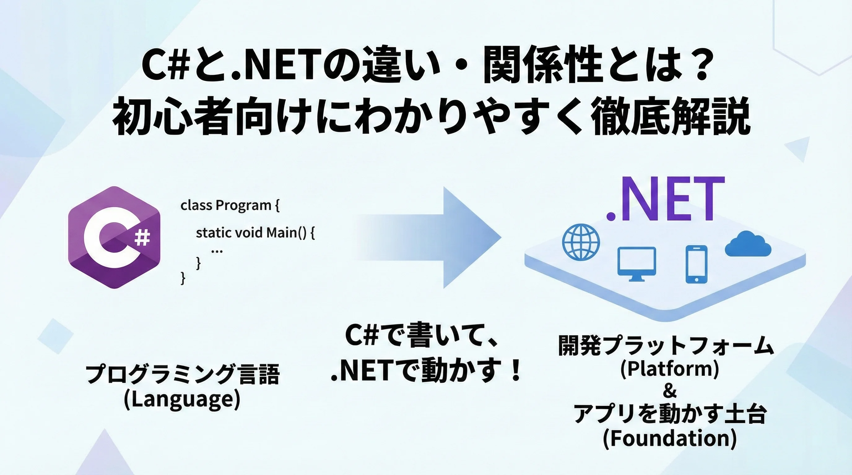 C#は「何をしたいか」を記述するための言語であり、.NETは「それをどう動かすか」を受け持つプラットフォームです。
