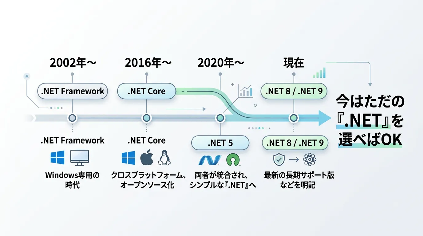 学習者が最も混乱するのが、「.NET Framework」「.NET Core」「.NET 5/6/7/8/9」といった名称の違いです。