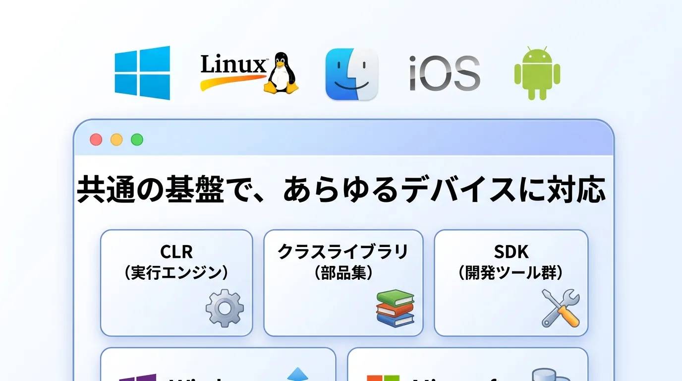 以前は「.NET Framework」という名前でWindows専用の仕組みとして知られていましたが、現在の最新バージョンである「.NET」はオープンソースであり、WindowsだけでなくMacやLinux、さらにはスマートフォンでも動作するクロスプラットフォームな環境へと進化を遂げました。