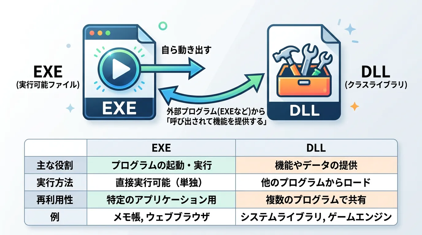 EXEがアプリケーションの「起動役」を担い、DLLが「機能の提供役」として裏方を支えることで、複雑なソフトウェアシステムが効率よく構築されています。
