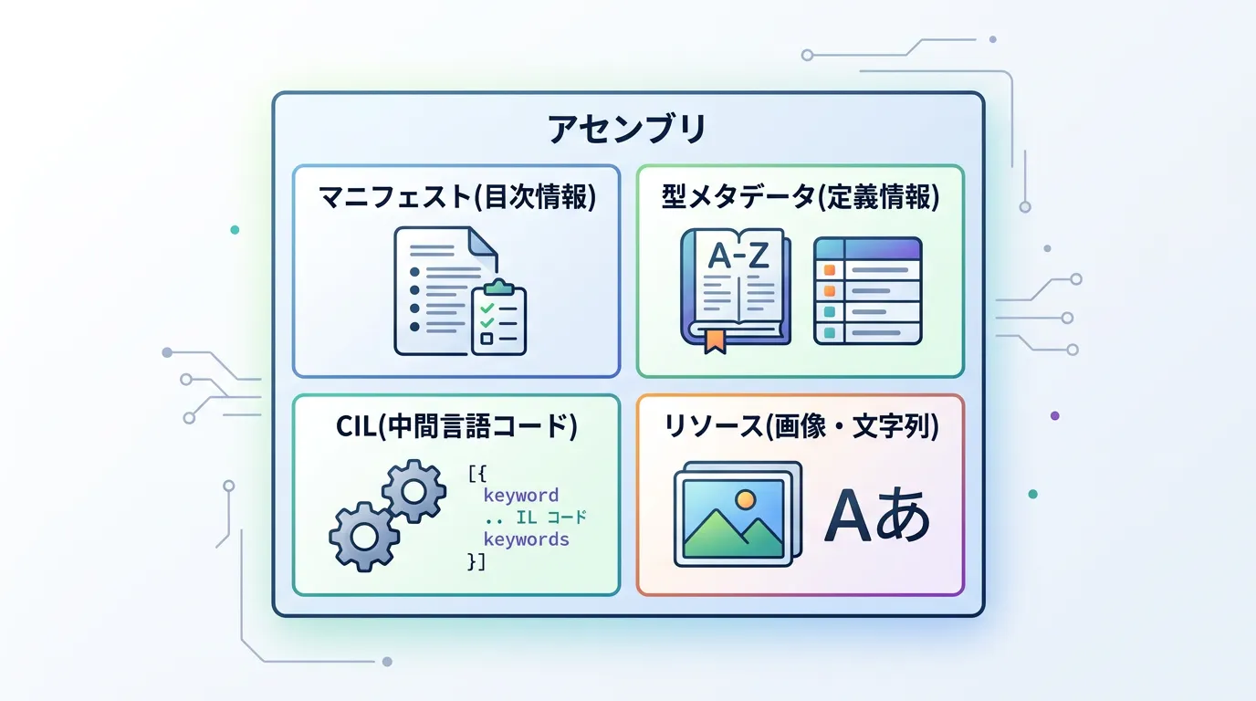 .NETアセンブリは、単なるプログラムの塊ではなく、CIL、メタデータ、マニフェスト、リソースが高度に統合されたパッケージです。