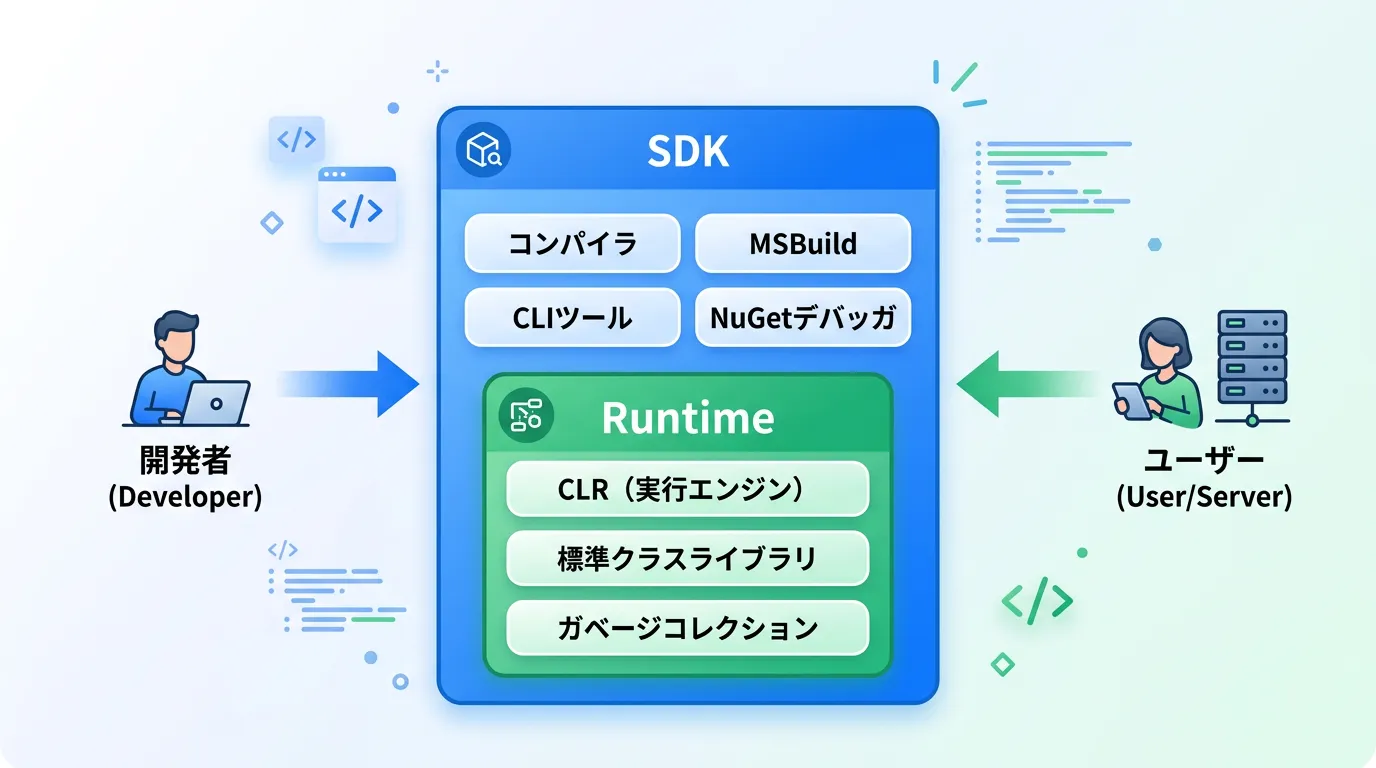 .NET SDKとRuntimeは、どちらも.NETエコシステムを支える重要なコンポーネントですが、その役割は「作る側」と「使う側」で明確に分かれています。