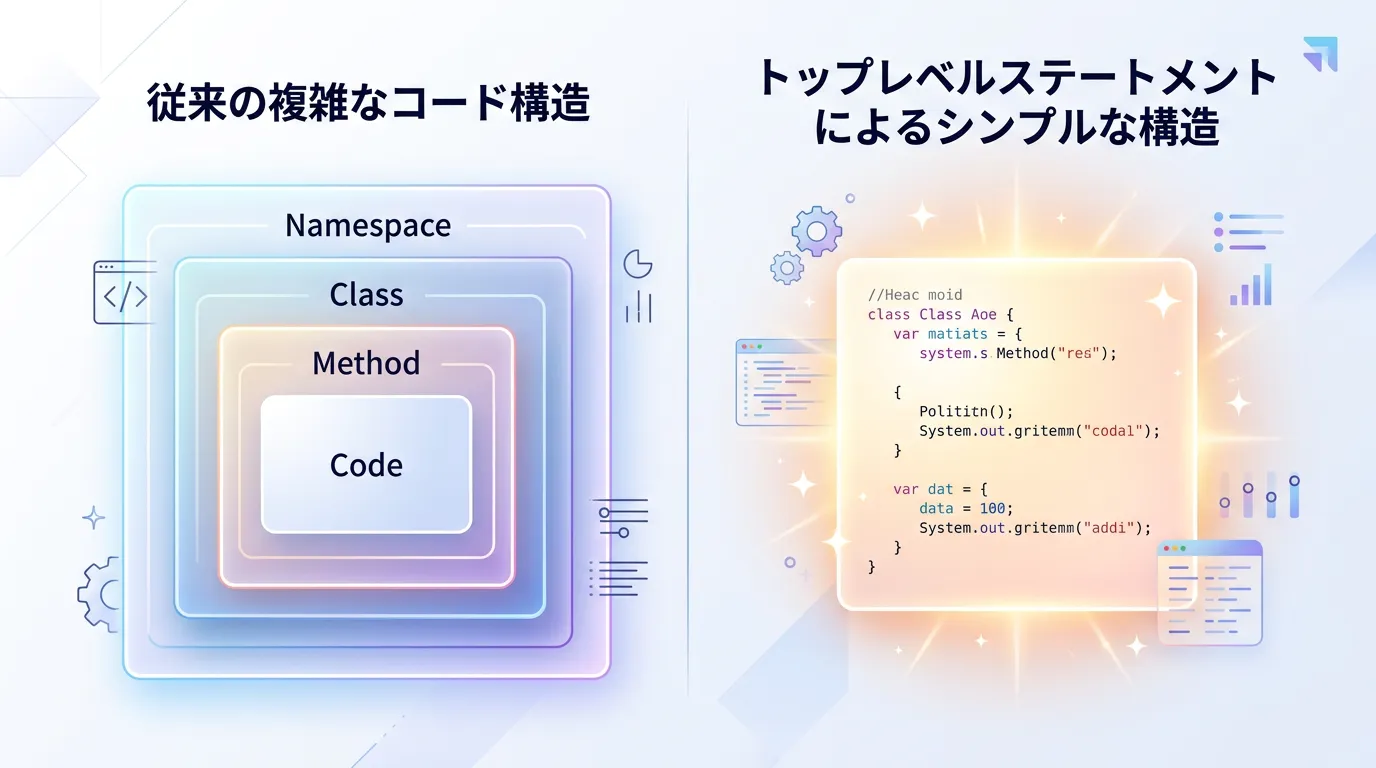 その象徴的な機能の一つが、C# 9.0で導入されたトップレベルステートメントです。