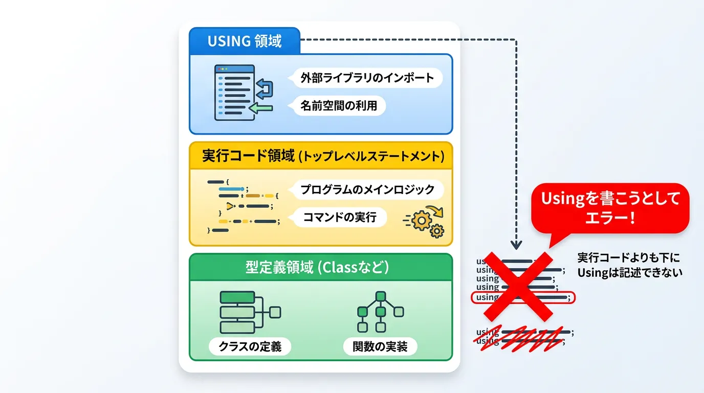 特に「トップレベルステートメントの後にusingを書く」といったミスは初心者が陥りやすいポイントです。