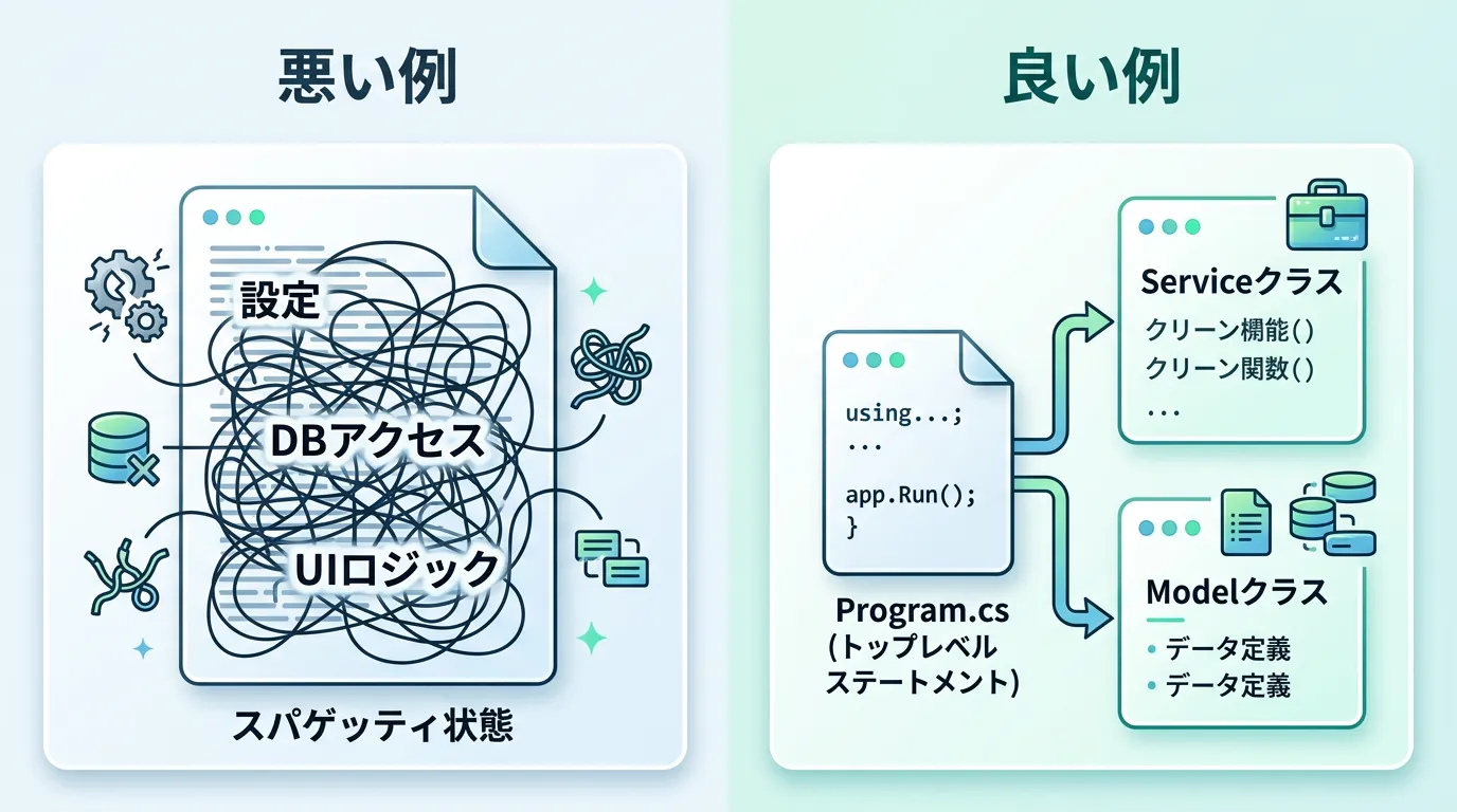 特に小規模なツールや、クラウドネイティブな軽量マイクロサービス(Minimal APIなど)を開発する際には、この簡潔さが大きな武器になります。
