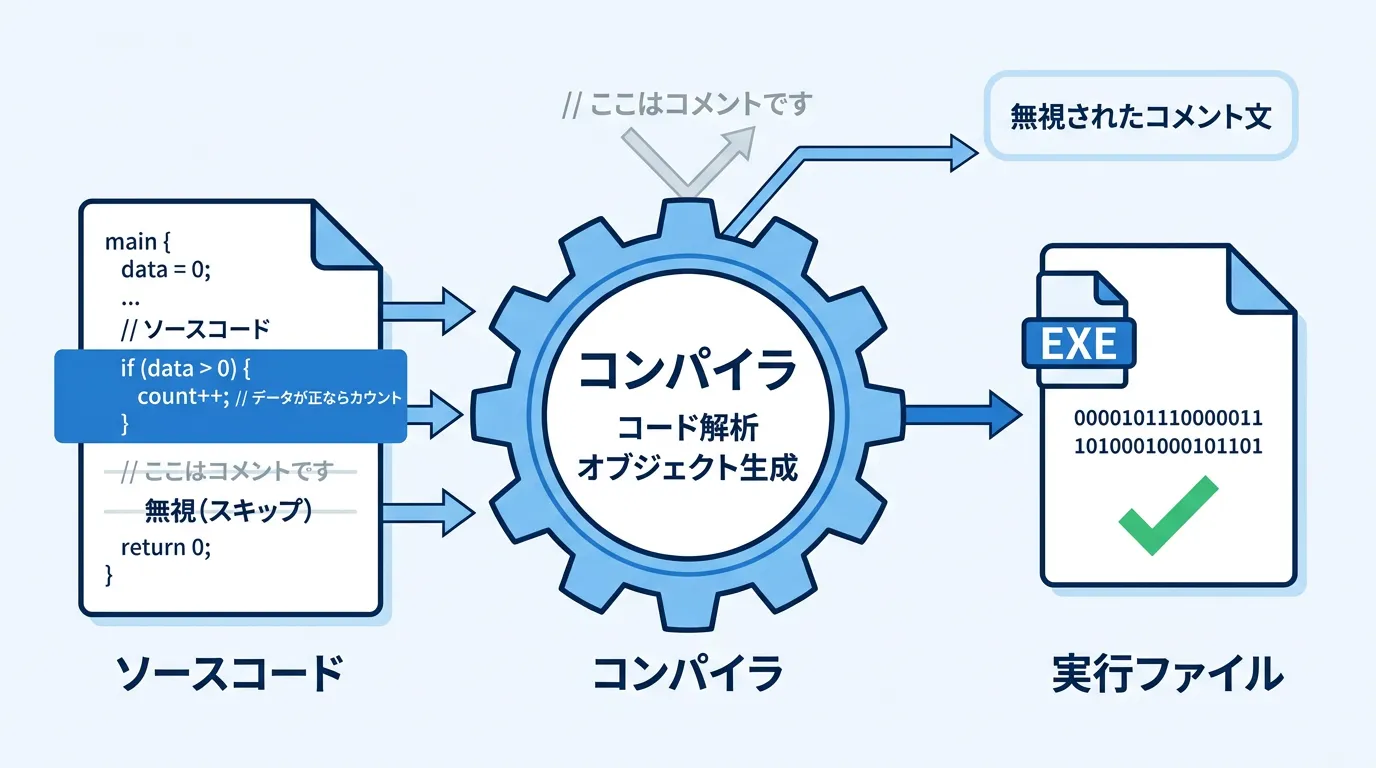 プログラムの中に記述されるコメントは、コンパイラによって無視されるため、実際の動作に影響を与えることはありません。