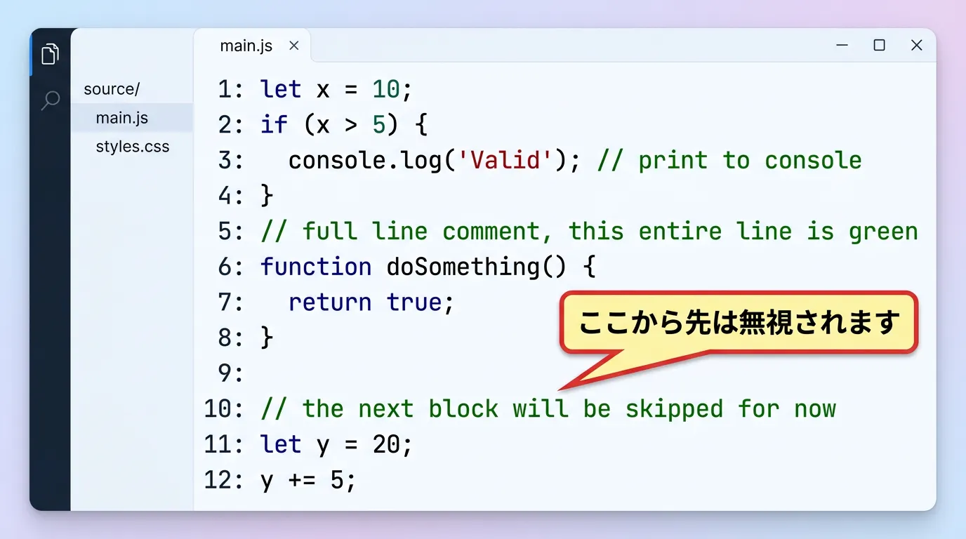 複数の行にわたる長い説明を書きたい場合や、大きなコードブロックを一括で無効化したい場合には、ブロックコメントを使用します。