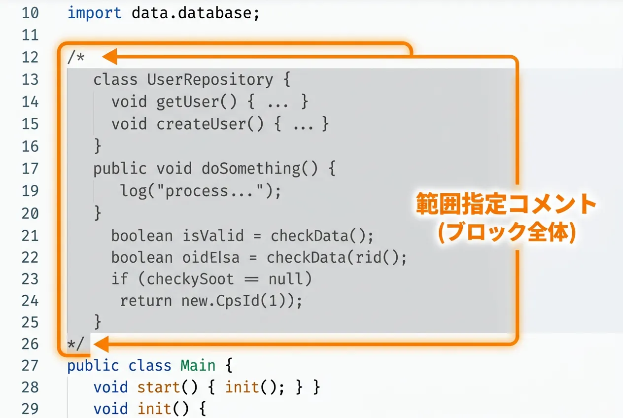 大規模なコードの無効化を行う際は、後述するプリプロセッサ命令やショートカットキーによる1行コメントの連続使用が推奨されます。