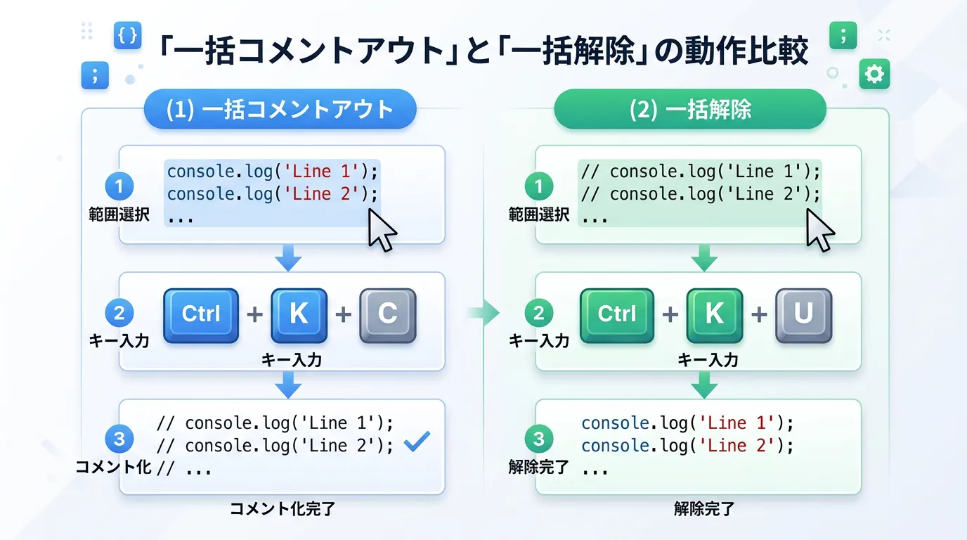 特にVS CodeのCtrl + /は、コメントの状態を反転(トグル)させるため、非常に使い勝手が良いです。
