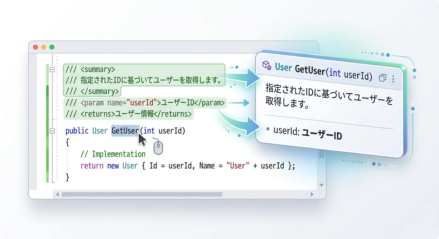 プロフェッショナルな現場では、パブリックなメソッドには必ずXMLドキュメントコメントを記述するというルールが設けられていることが多いです。
