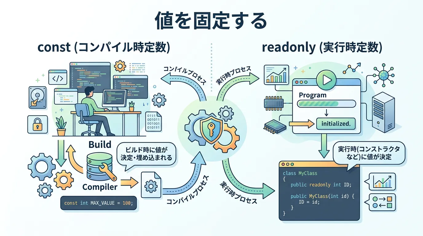 「コンパイル時に決まる絶対的な不変値」にはconstを使い、「実行時に決まる値や、柔軟性・安全性を重視する値」にはreadonlyを選択するのが基本です。