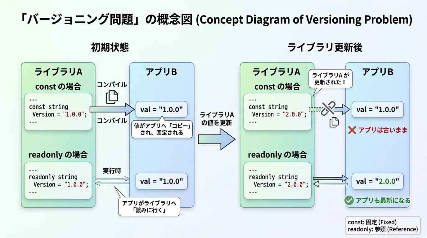 特に、外部に公開するライブラリを作成する場合や、複雑なオブジェクトを扱う場合には、readonly(またはstatic readonly)の方がバージョニングのトラブルを避けやすく、安全です。