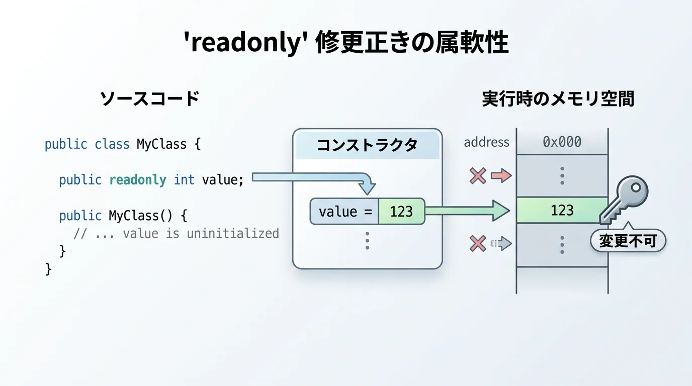 このように、現代のC#開発では、不変性(イミュータビリティ)を保つためにreadonlyを積極的に活用する設計が推奨されています。
