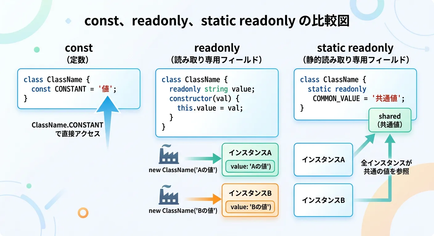 このように、readonlyは「その変数が別のインスタンスを指すこと」を禁止しますが、インスタンス内部の状態変更まで防ぐものではありません。