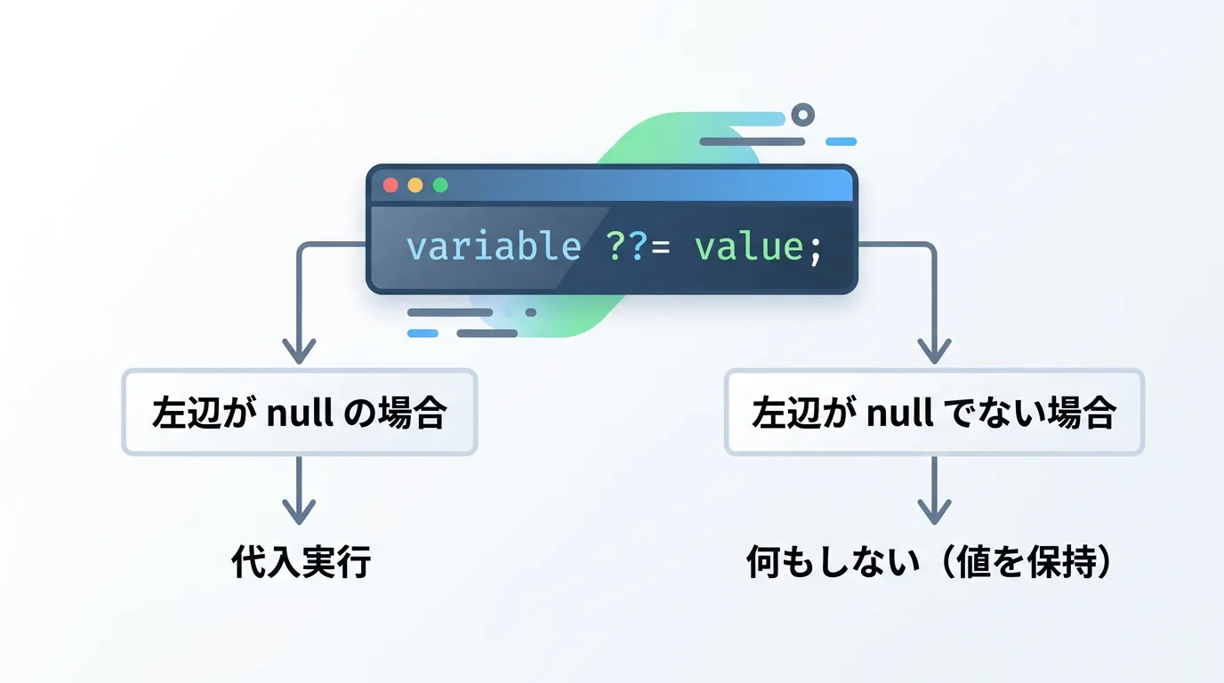 ??=演算子は、左辺の変数がnullである場合にのみ、右辺の値をその変数に代入する演算子です。