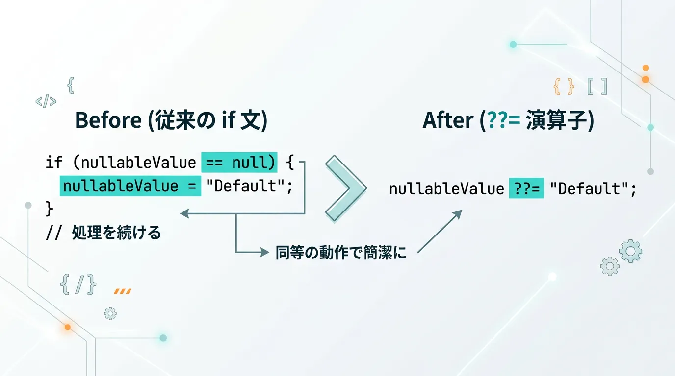 C# 8.0で導入された「null合体代入演算子(??=)」は、このような冗長になりがちなnullチェックと代入を、劇的に短く、そして読みやすく書き換えることができる強力な演算子です。