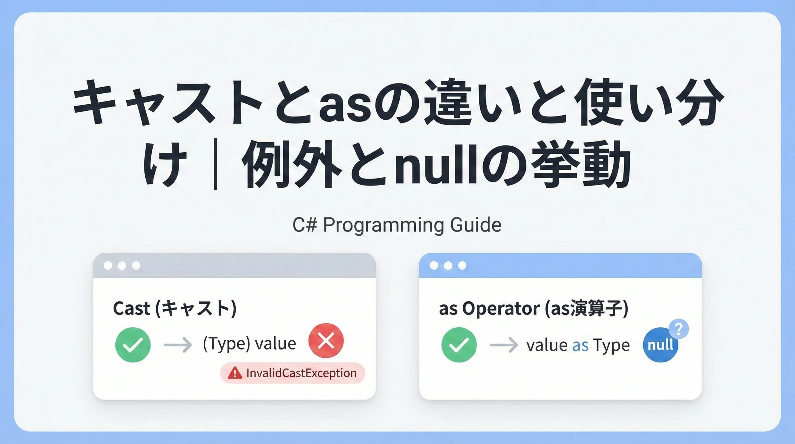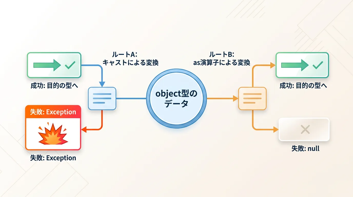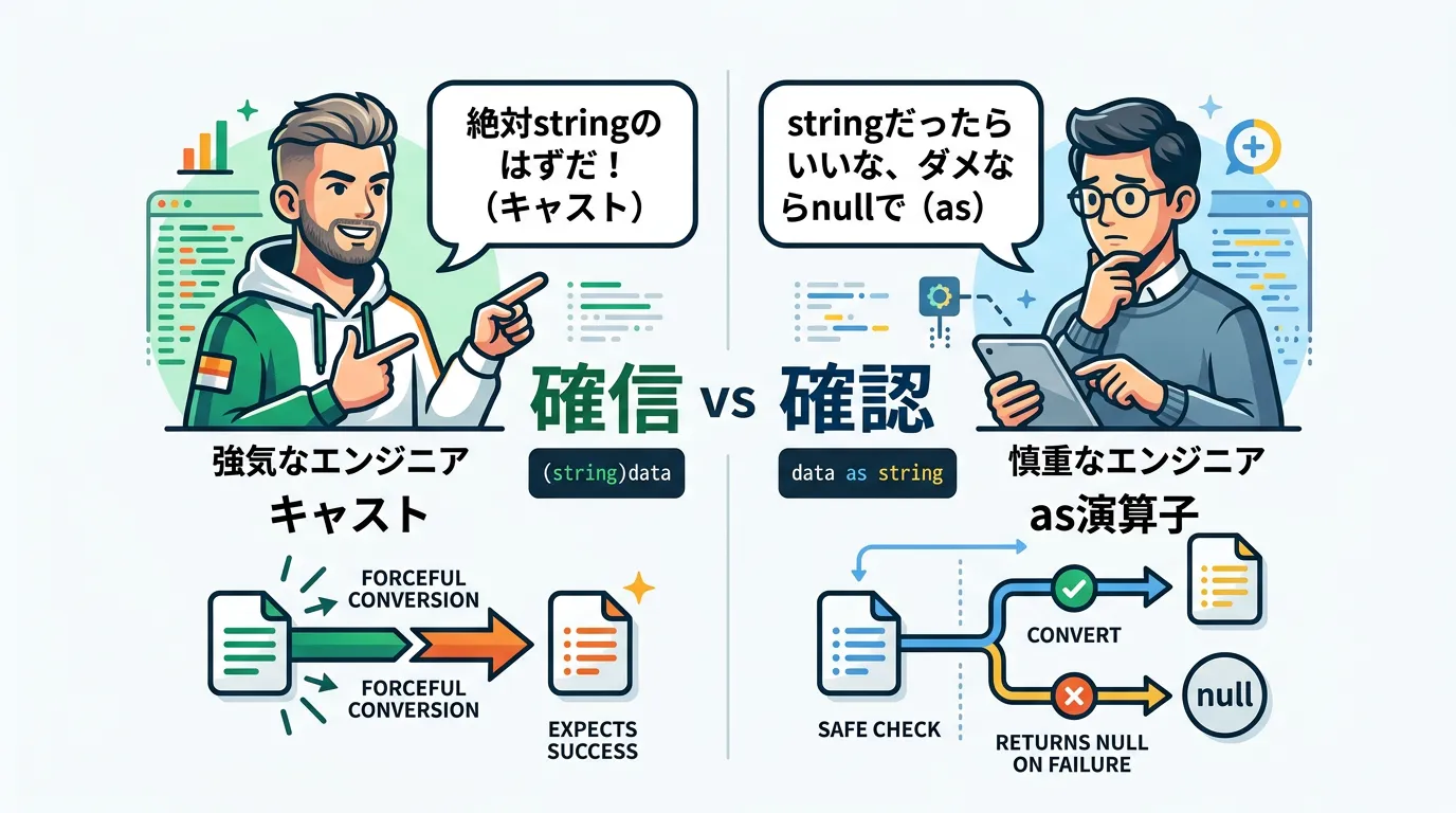 C#におけるキャストと as 演算子の使い分けは、単なる好みの問題ではなく、「例外設計」と「型の安全性」に直結する重要な選択です。